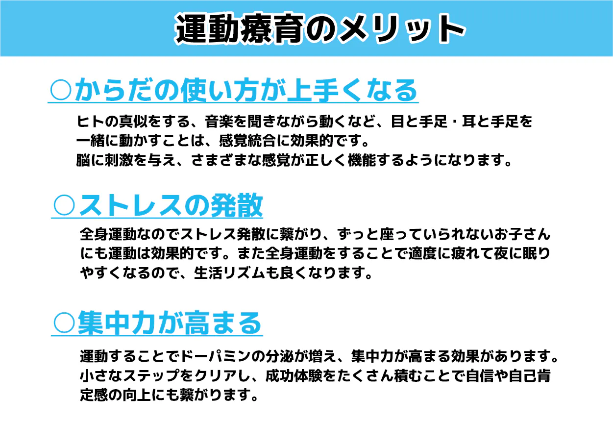 運動療育とは、基本的な運動能力を身につけることや、コミュニケーション能力・協調性・集中力を高めるといったプログラムです。