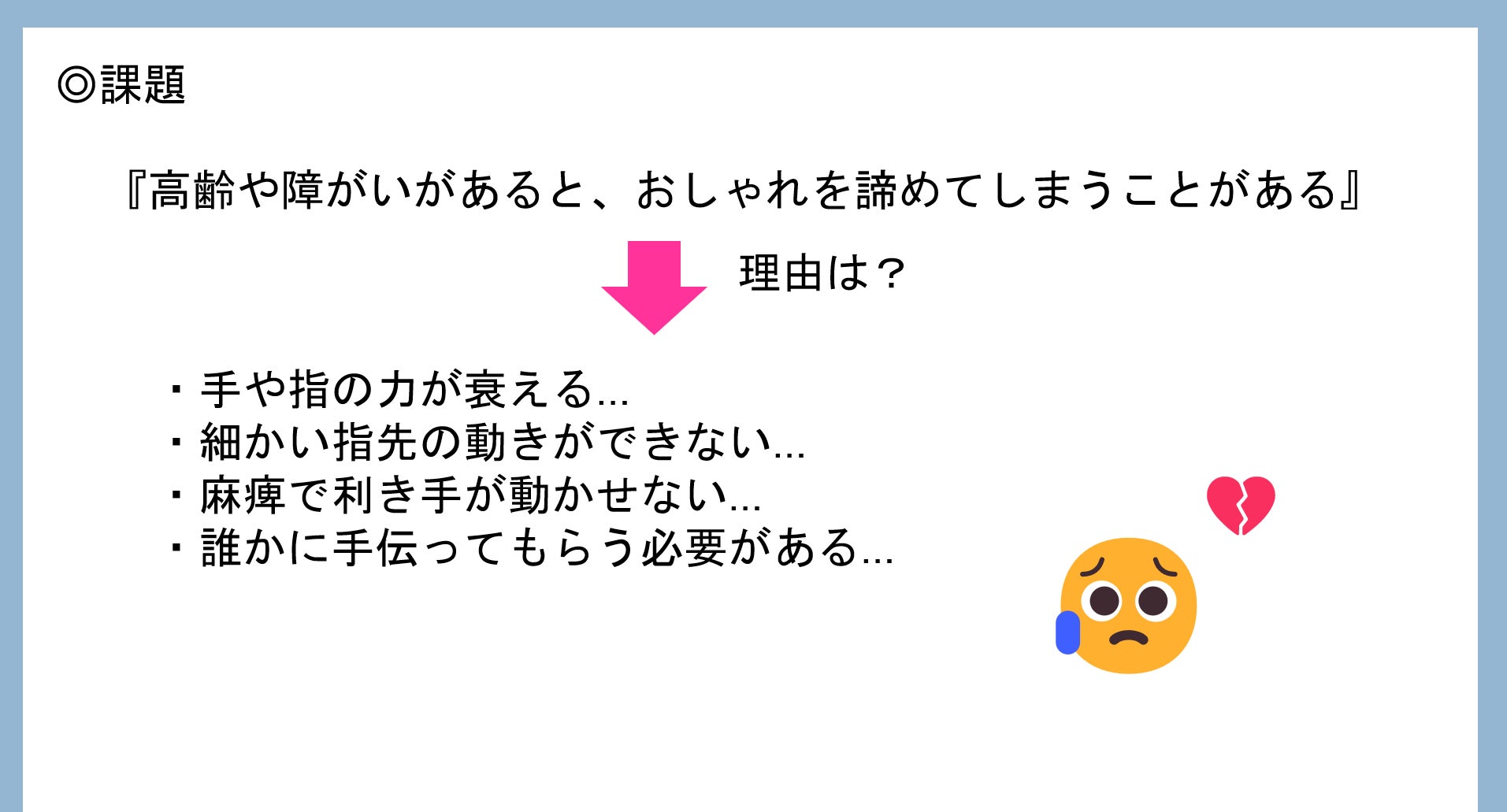 リハビリを提供するなかで「高齢者」、「片麻痺(片方の手足が動かしづらい状態)」や「進行性難病(パーキンソン病、ALSなど)」、「先天性疾患(脳性まひや自閉症、ダウン症など)」を抱えた様々な年齢の方と関わってきました。多くの方は、好きな服を着たり・好きなアクセサリーを自分でつけたりすることは【障がいを抱えた自分には出来ないこと】と諦めてしまい、おしゃれは誰もが簡単に楽しめることではないことを目の当たりにしました。好きなアクセサリーをつけておしゃれをすることは、障がいの有無に関わらず誰もが楽しめる物であってほしいと私たちは考えています。