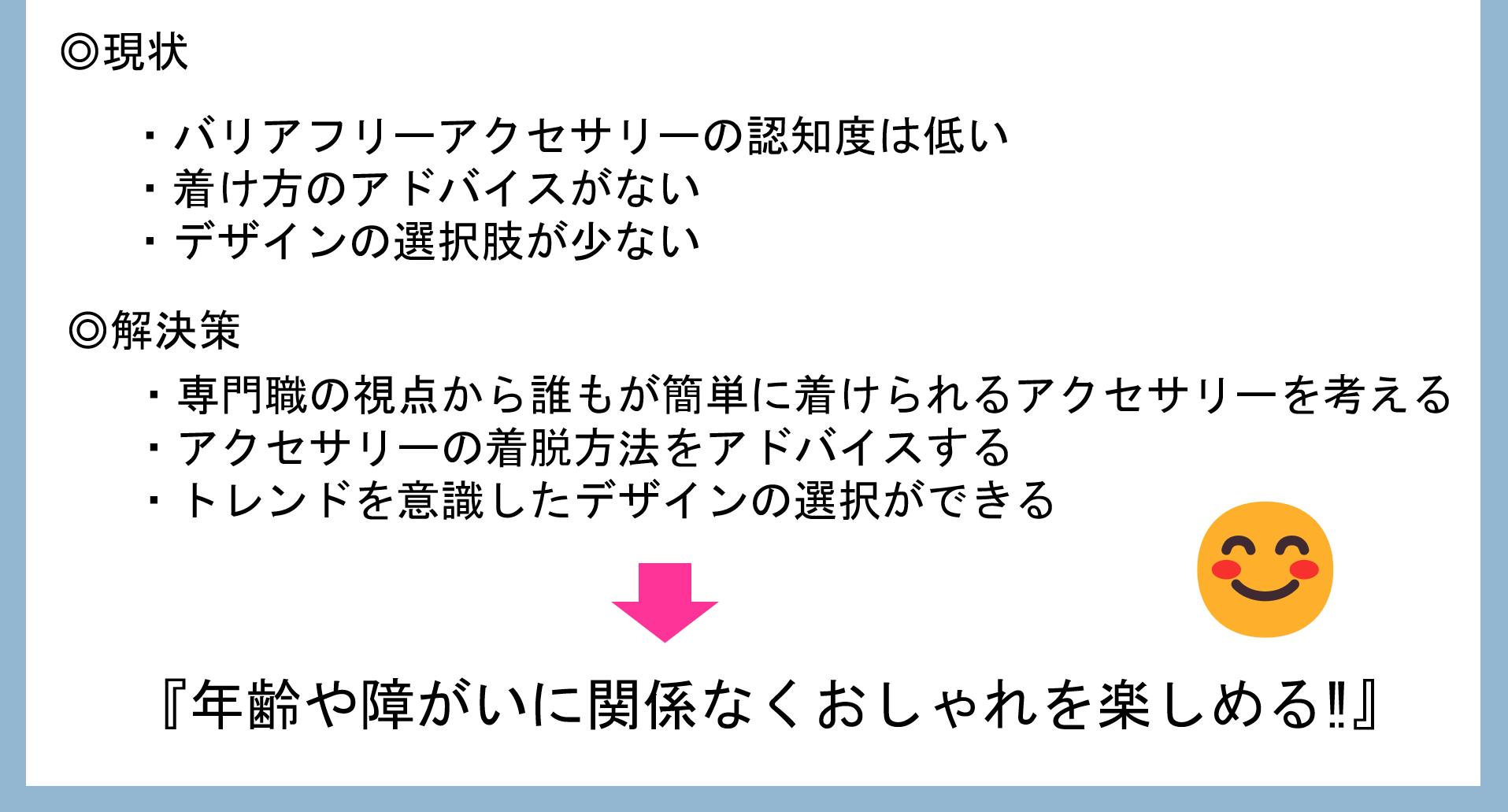年齢や抱えている障がいは人それぞれであり様々な方と出会いリハビリを提供してきました。その多くの方は「もう身なりなんてどうでもいい。」「障がいを抱えている自分はおしゃれとは無縁になってしまった。」「どうせ自分ではつけられない。」と話しており、挑戦する前から諦めてしまっていることが現状でした。では、【着脱が簡単なアクセサリーが売っているオンラインショップ】や【着脱方法のコツを発信できる専門家がオンラインショップ】を運営していたら、少しは挑戦する気持ちが沸いたり、おしゃれがしたくてもできなかった方々に身近に感じて貰えるのではないかと私たちは思いました。