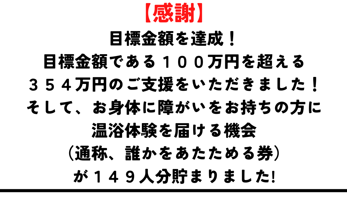 2022/12/20 12:11クラウドファンディングが無事に終了し、目標金額である100万円を大幅に超えた354万円を達成いたしました!そして、お身体に障がいをお持ちの方に温浴体験を届ける機会(通称、誰かをあたためる券)が149人分も貯まりました! 本券の対象者は後日、募らせていただきます。 皆様、応援ありがとうございました! もっと見る