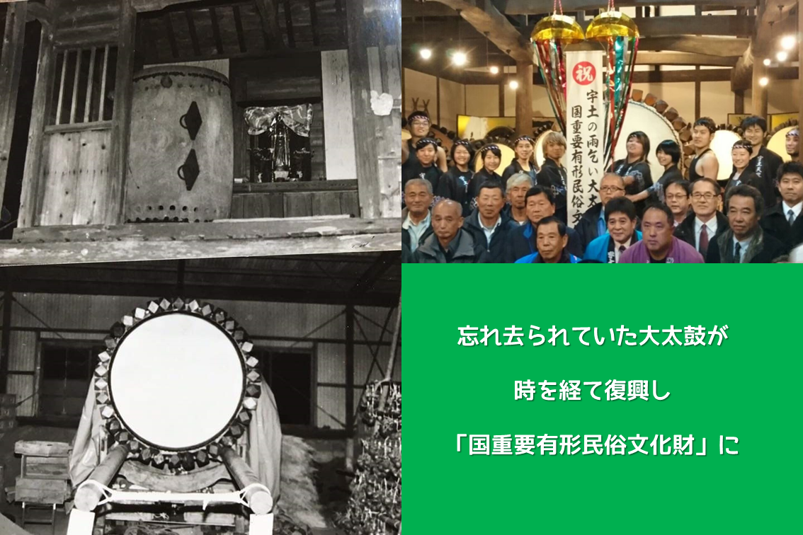 熊本県宇土市に残されている26基の大太鼓は、江戸時代以降、当時の集落ごとに「雨乞い」や「虫追い」用として所有していたものです。戦前までは、各集落で稲の豊作を祈る「雨乞い祭り」が盛んに行われていましたが、戦後は徐々に衰退し、戦後になるとそれらの伝統行事はほとんど行われなくなっていました。
