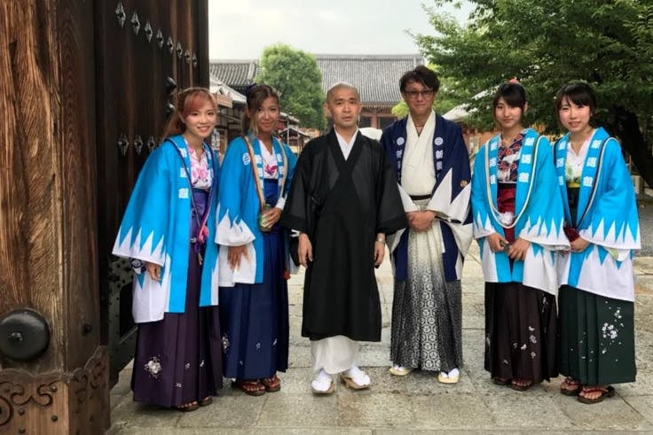 (写真)中央 友人であり壬生寺住職のご子息であり、同級生の松浦氏 その右に著者 岩並氏 2人を囲むのがご当地アイドル「新選組『華』」;現在は惜しまれながら解散してしまいました。