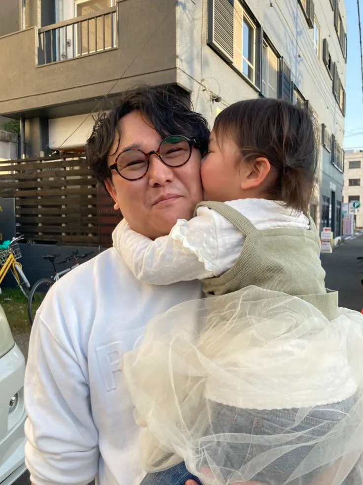 (写真)岩並裕義氏とお孫さん 思いがけないキスにめろめろ