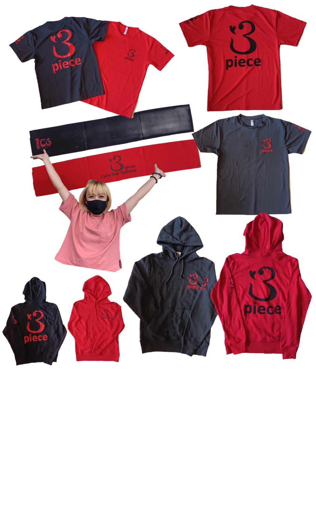 3piece特製Tシャツ1枚(赤か黒のご希望とサイズ男女兼用S・M・L・LLをお知らせください)