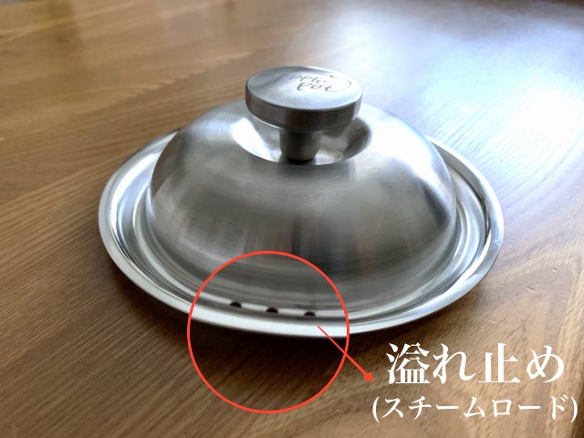 スチームホールから出る蒸気は出たり入ったりしますが、水分が大量の場合スチームロードの溝に沿って移動し、鍋の外側へ吹きこぼれにくい構造です。