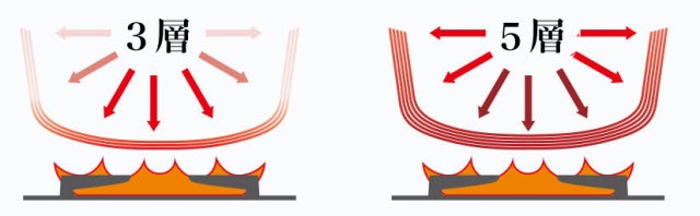 5層ステンレス鍋は3層ステンレスより底面と側面の温度差少なくホットスポット(1ヵ所だけ集中的に加熱する現象)がなく、弱火から強火調理まで幅広く使用可能です。