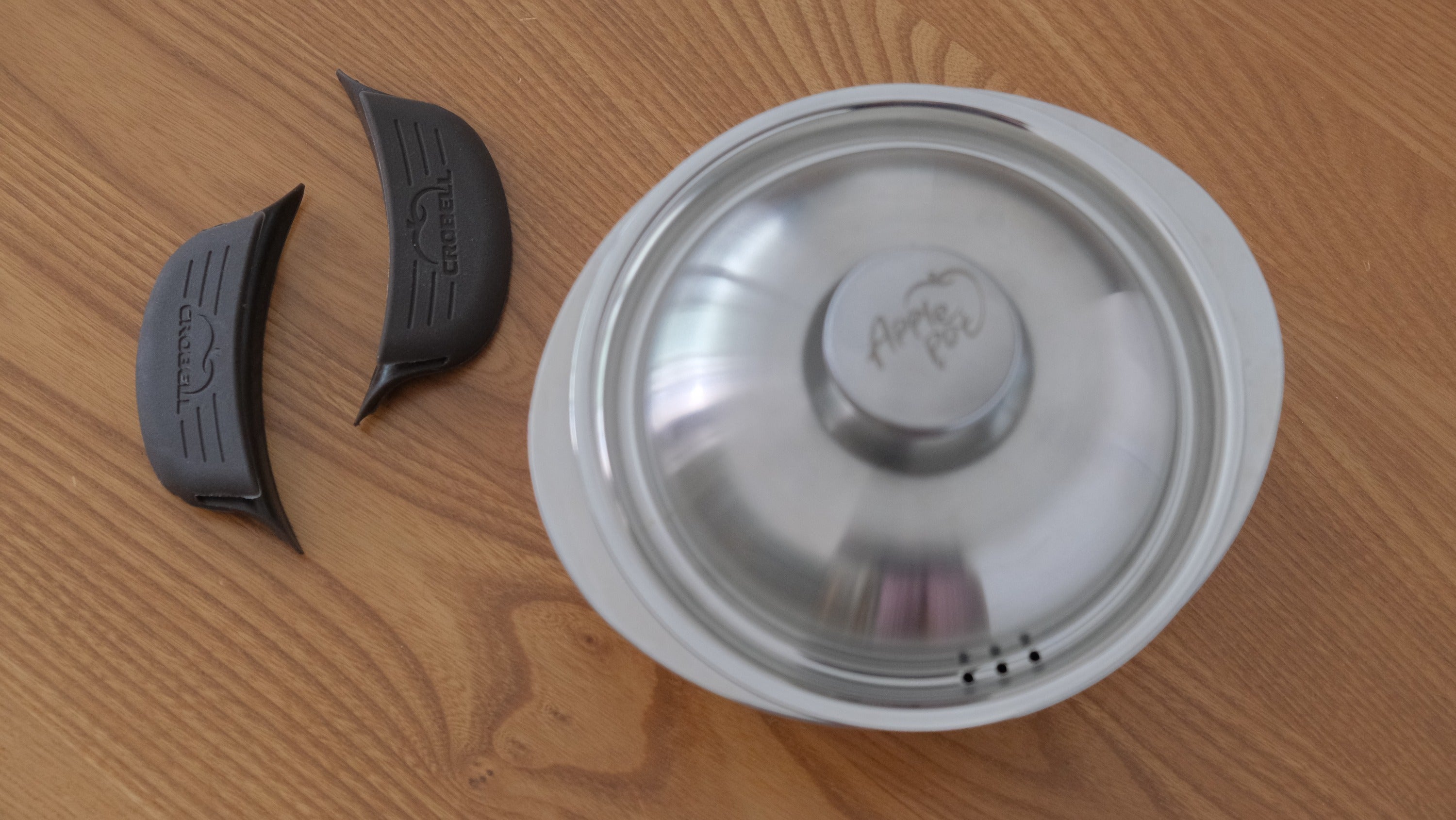13.調理後の持ち運びには必ず付属のシリコン製持ち手をご使用ください。アップルポットは保温性が非常に高く直接触ると火傷の原因となります。