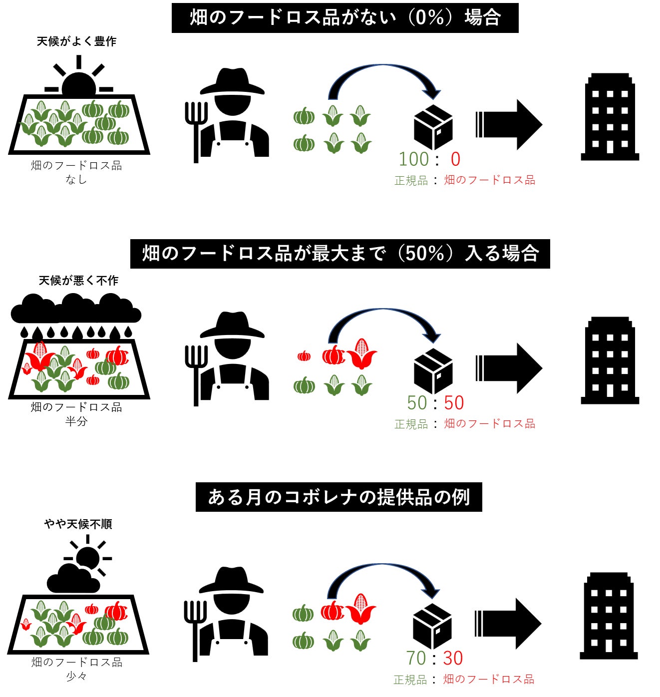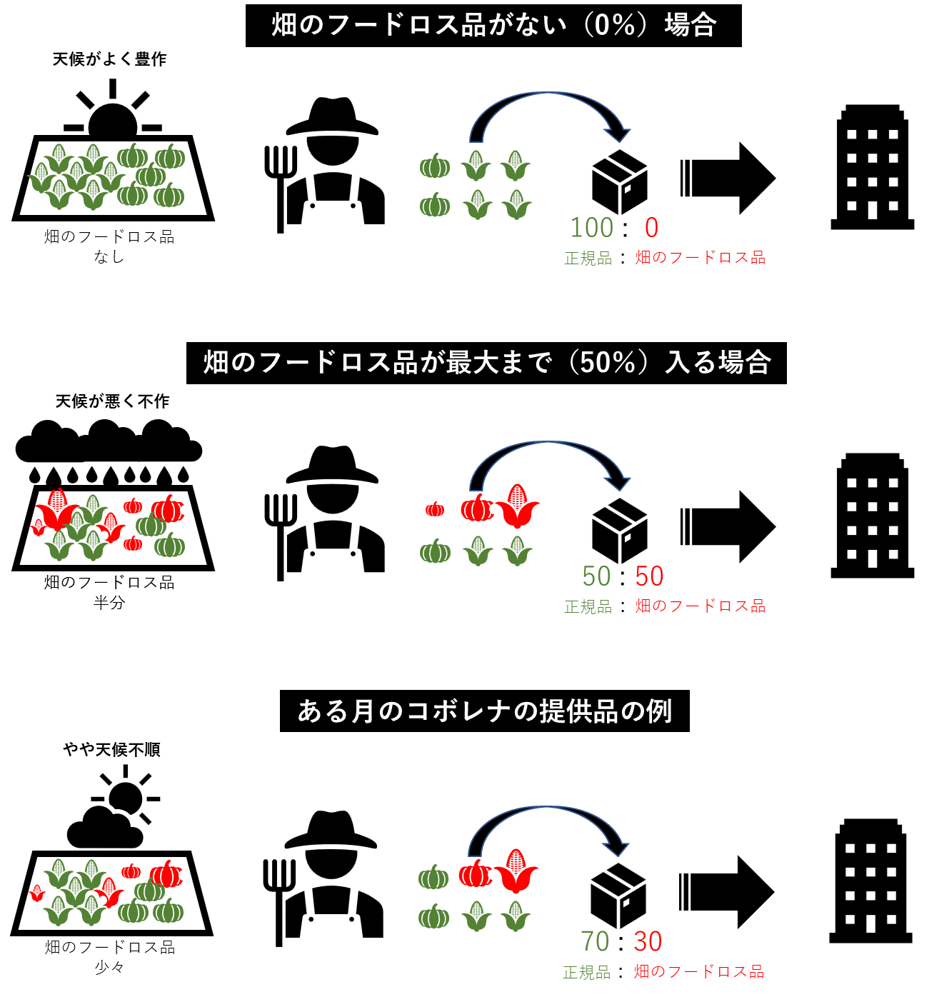 生産者が作りたいのは「規格に沿った農作物」です。そのために「規格外のものができないよう」努力されています。つまり出ないに越したことはない。ですから困っているとき(規格外がたくさんあるとき)というのは、うまくいかなかった一部のタイミングです。「毎月○kgぐらい出るうち、何%を買い取らせて」といったビジネスは成立しません。