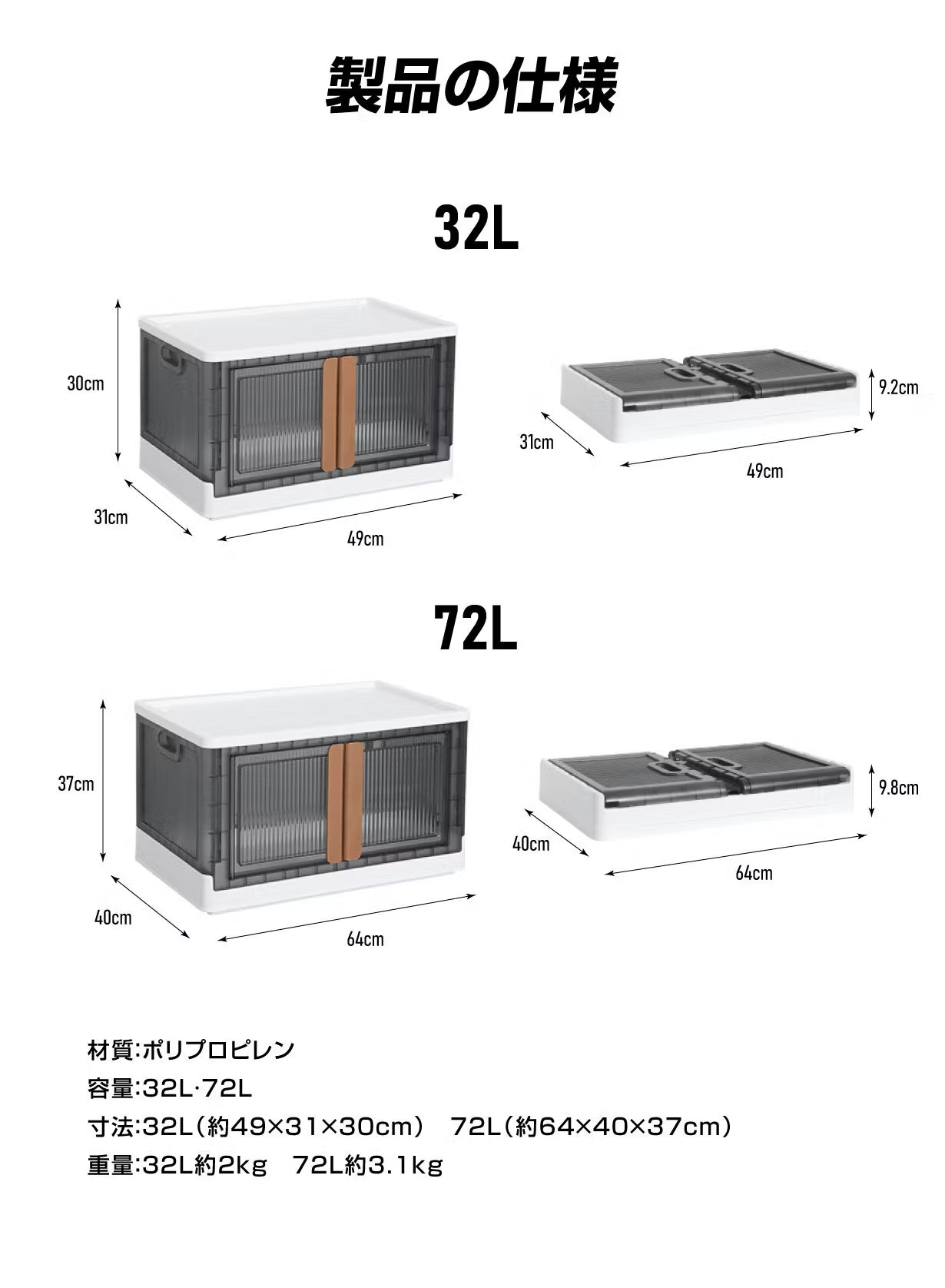 ご覧ください! この【折り畳みコンテナボックス】は 両開きの扉で四方は半透明なので中身が分かりやすく、フタ付きで積み重ねが出来ます。折りたたみ式なので使わないときは少しのスペースに収納出来ます。底に車輪が付けれますので移動も簡単!
