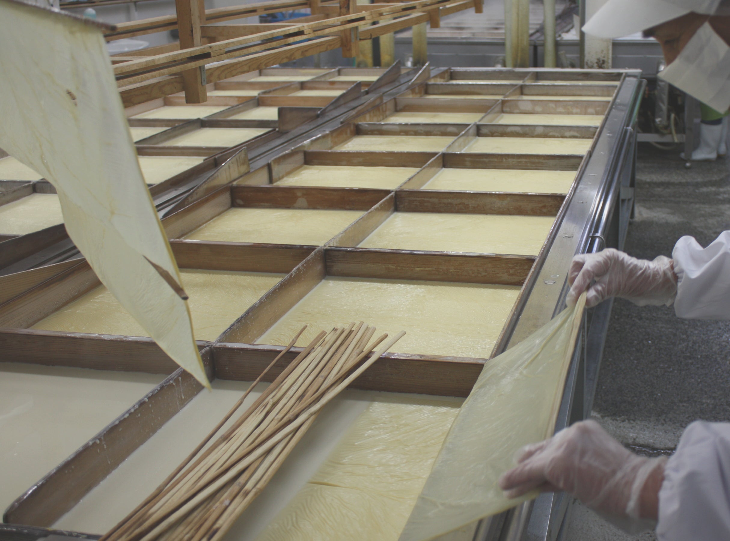 -湯葉が張る様子とゆば揚げ作業-