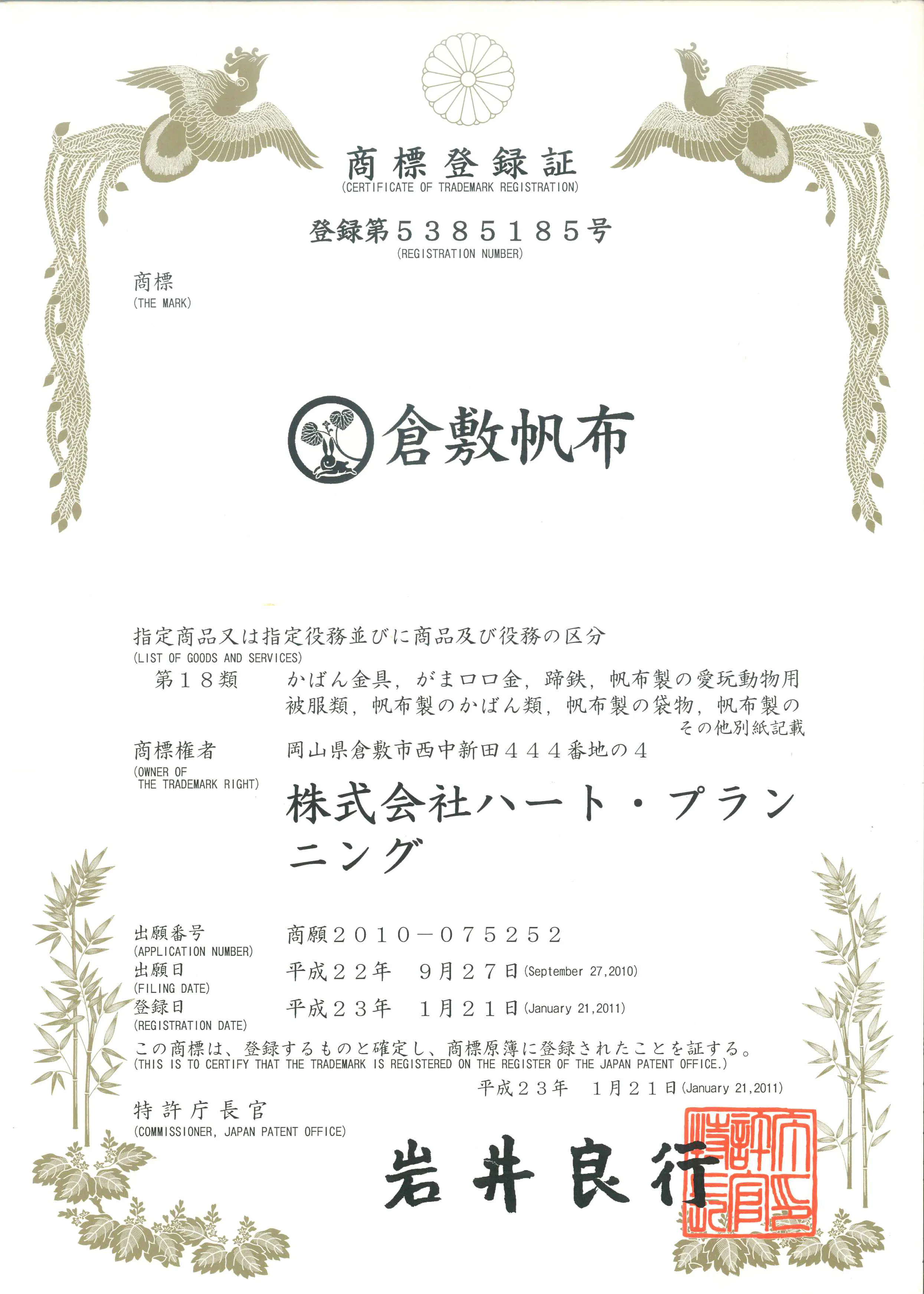 弊社では、平成23年に『倉敷帆布』の商標を取得しました。