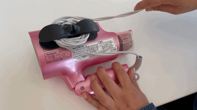 家電の本体に貼り付けて(粘着テープ式)、コードをくるくると巻きつけるだけ。
