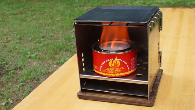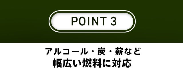【卓火 TAKUBI】は固形燃料や薪、炭といった燃料はもちろん、付属のアルコールストーブを使えば液体燃料の使用も可能。