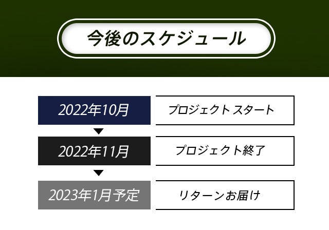 ※本文中に記載させていただいたスケジュールは、あくまでプロジェクト公開時点の予定です。ご支援の性質上、配送遅延のおそれがございます。原則として、配送遅延に伴うご支援のキャンセルはできませんが、リターン配送予定月から6ヵ月を超えた場合には、希望者に限りキャンセルにて対応させていただきます。