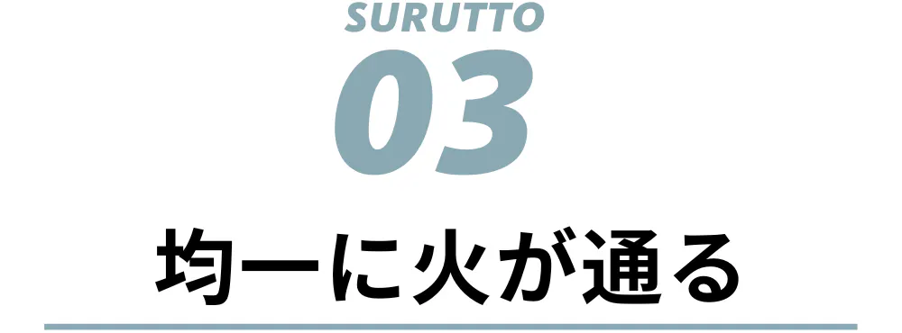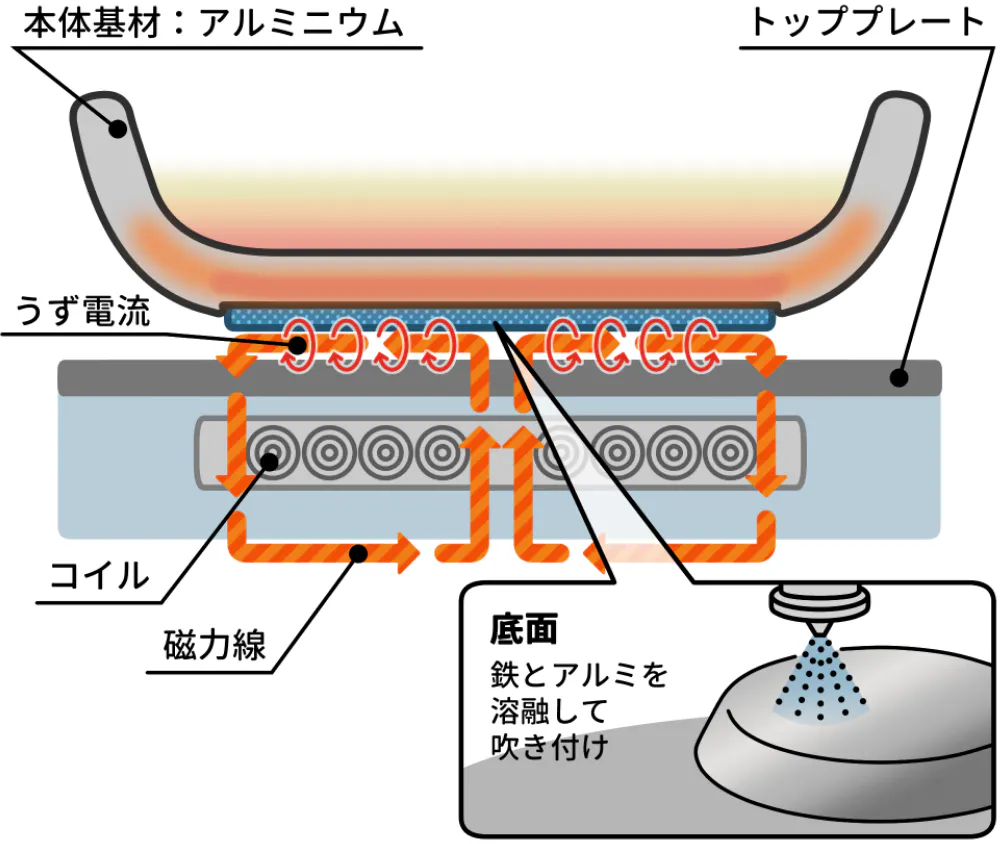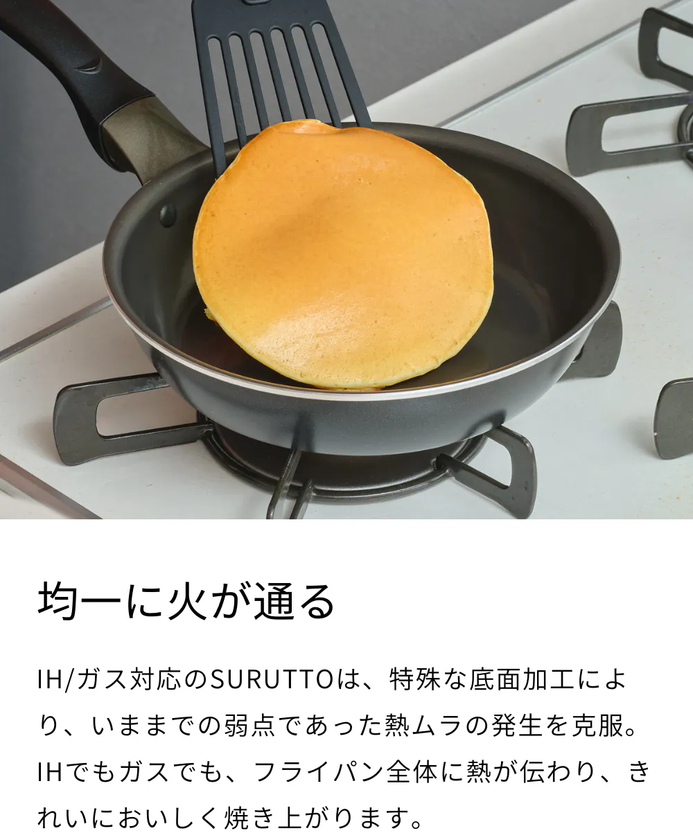一般的なIH/ガス対応フライパンは底面に異なる素材を無理矢理貼り合わせているのに対し、SURUTTOは溶射加工のおかげで熱変形が起こりにくいのが特徴です。