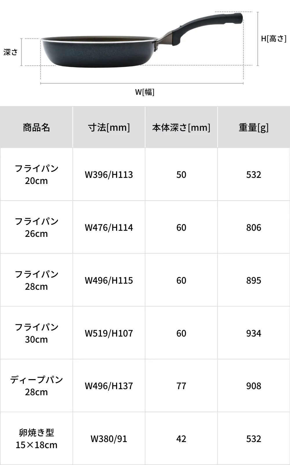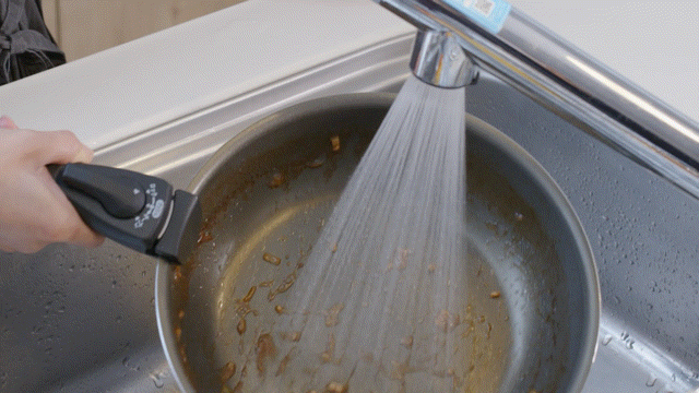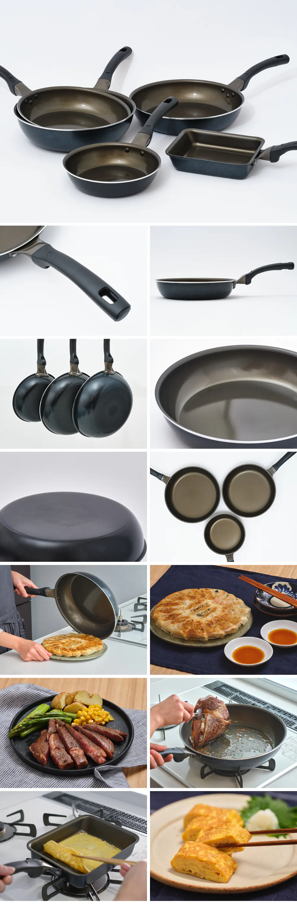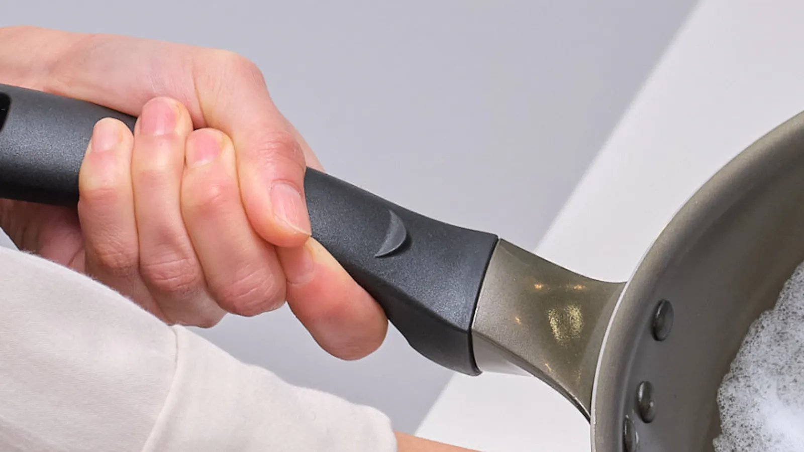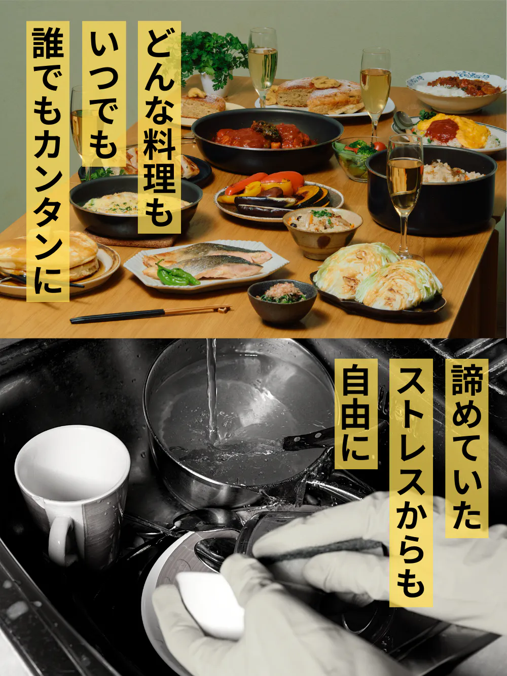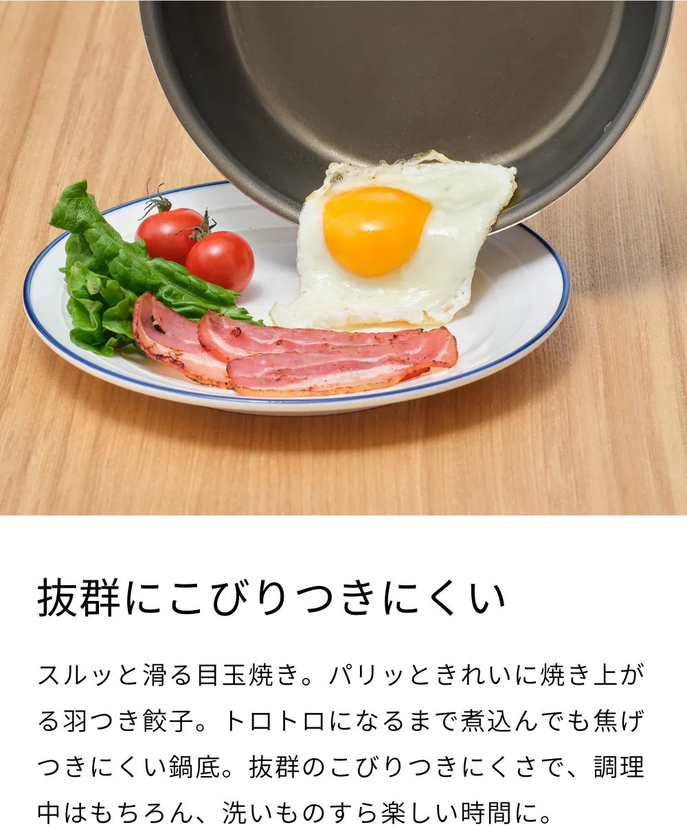 柔らかいスポンジと中性洗剤だけで、面倒なフライパン洗いが、まるで「お皿を洗うかのような手軽さ」になります。(※取っ手つき・取っ手がとれるシリーズとも、同じ内面加工を使用)