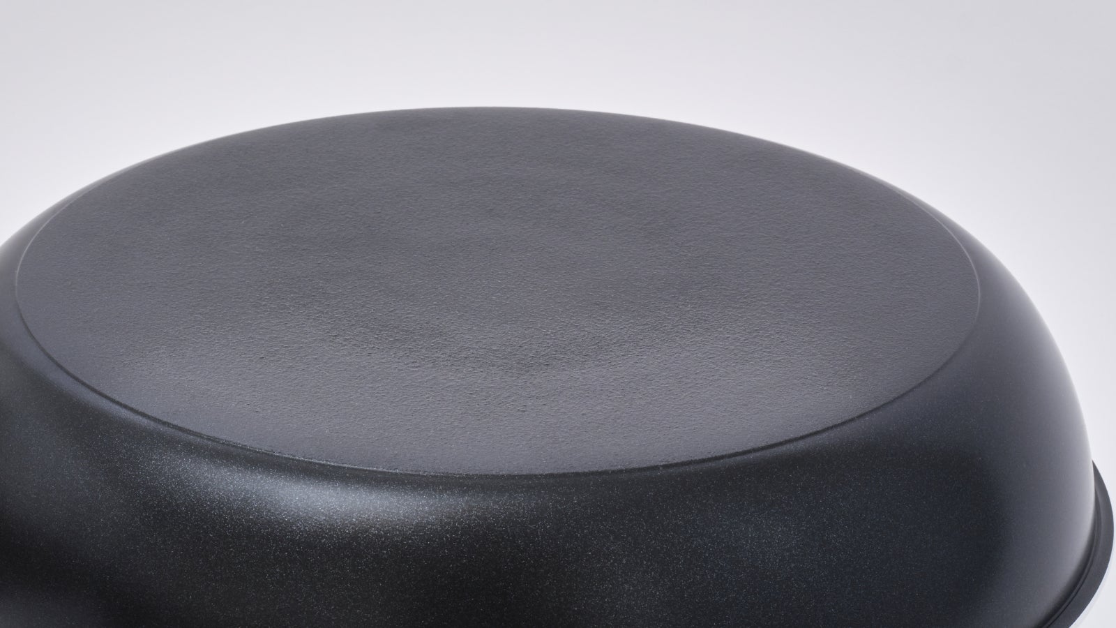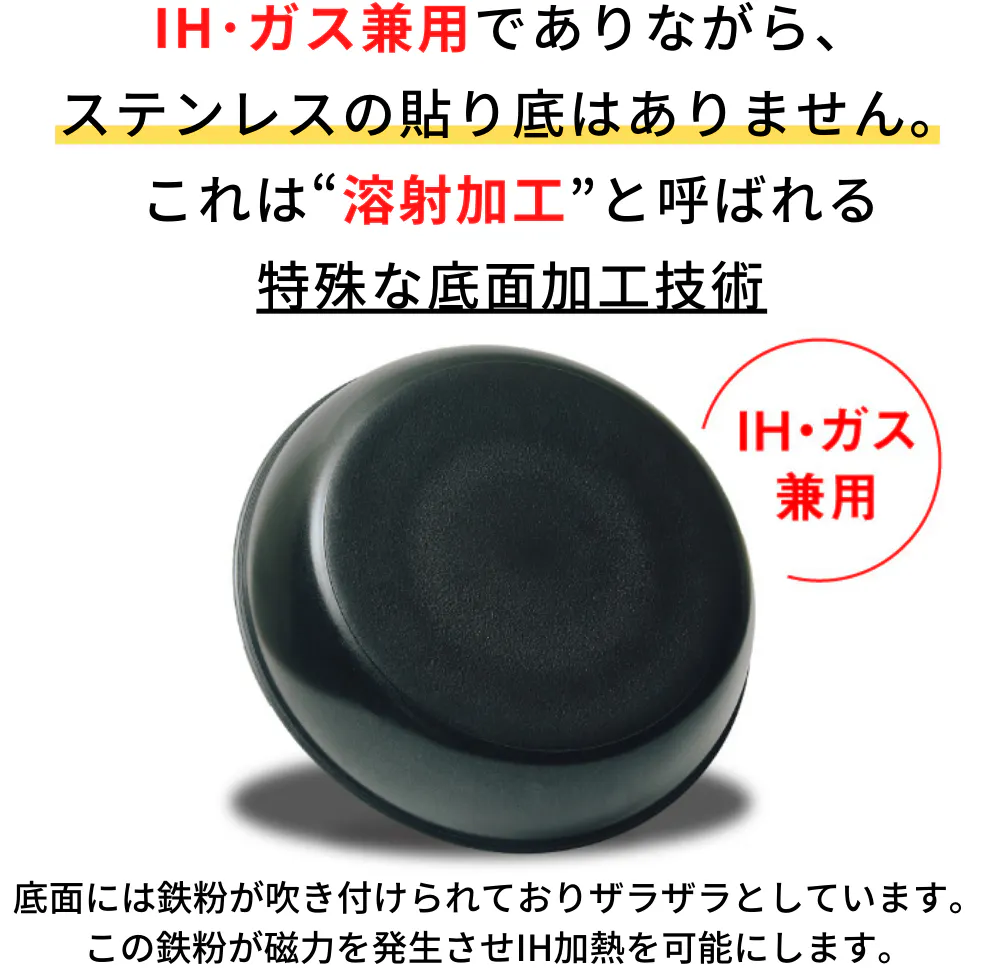 IH調理の際、食材に均一に熱が伝わるように底面の端ギリギリまで溶射加工がしてあります。