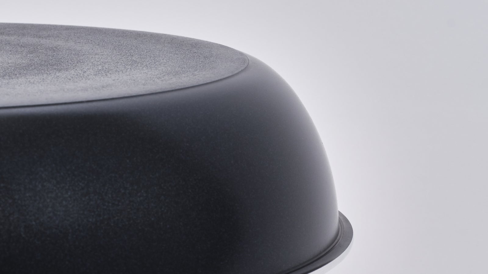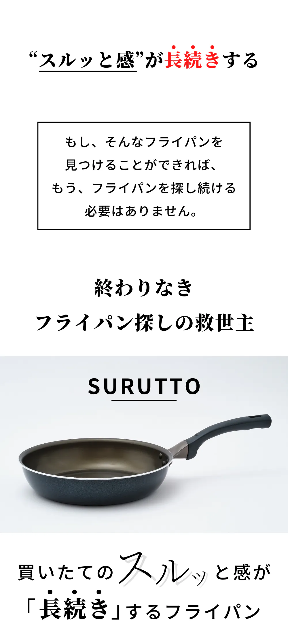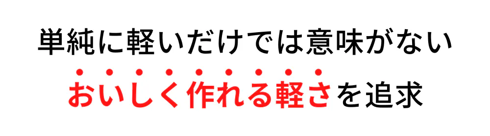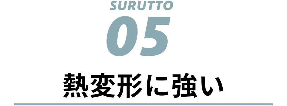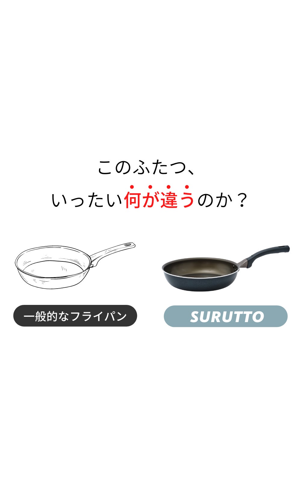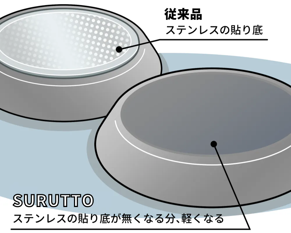 単純にフライパンの厚みを薄くすれば軽くなります。しかし、それでは蓄熱性が下がり、フライパン内の温度管理が難しくなり料理が作りにくい…、また、強度も不足するため、変形などにも弱くなってしまいます。かと言って厚みを出しすぎると重くて使いにくい…、SURUTTOは底面や側面の厚さを調整し、おいしく作れる軽さも追求しました。
