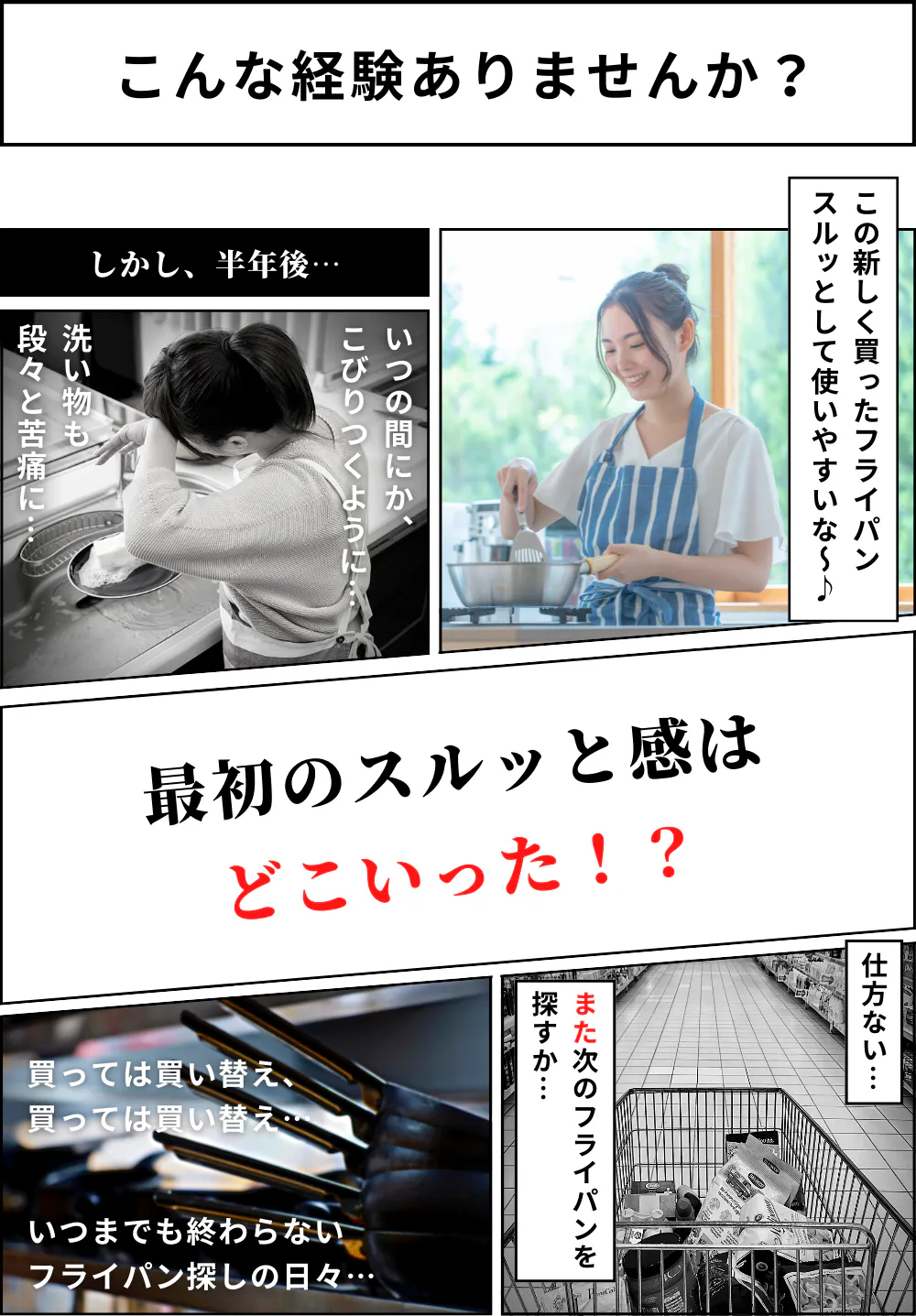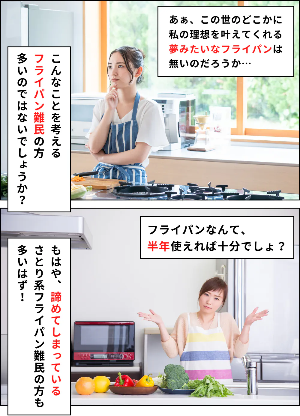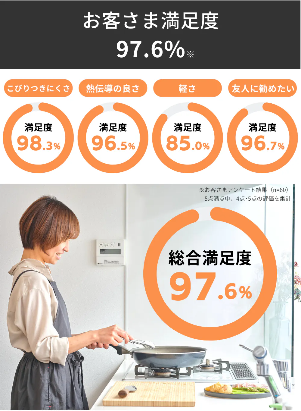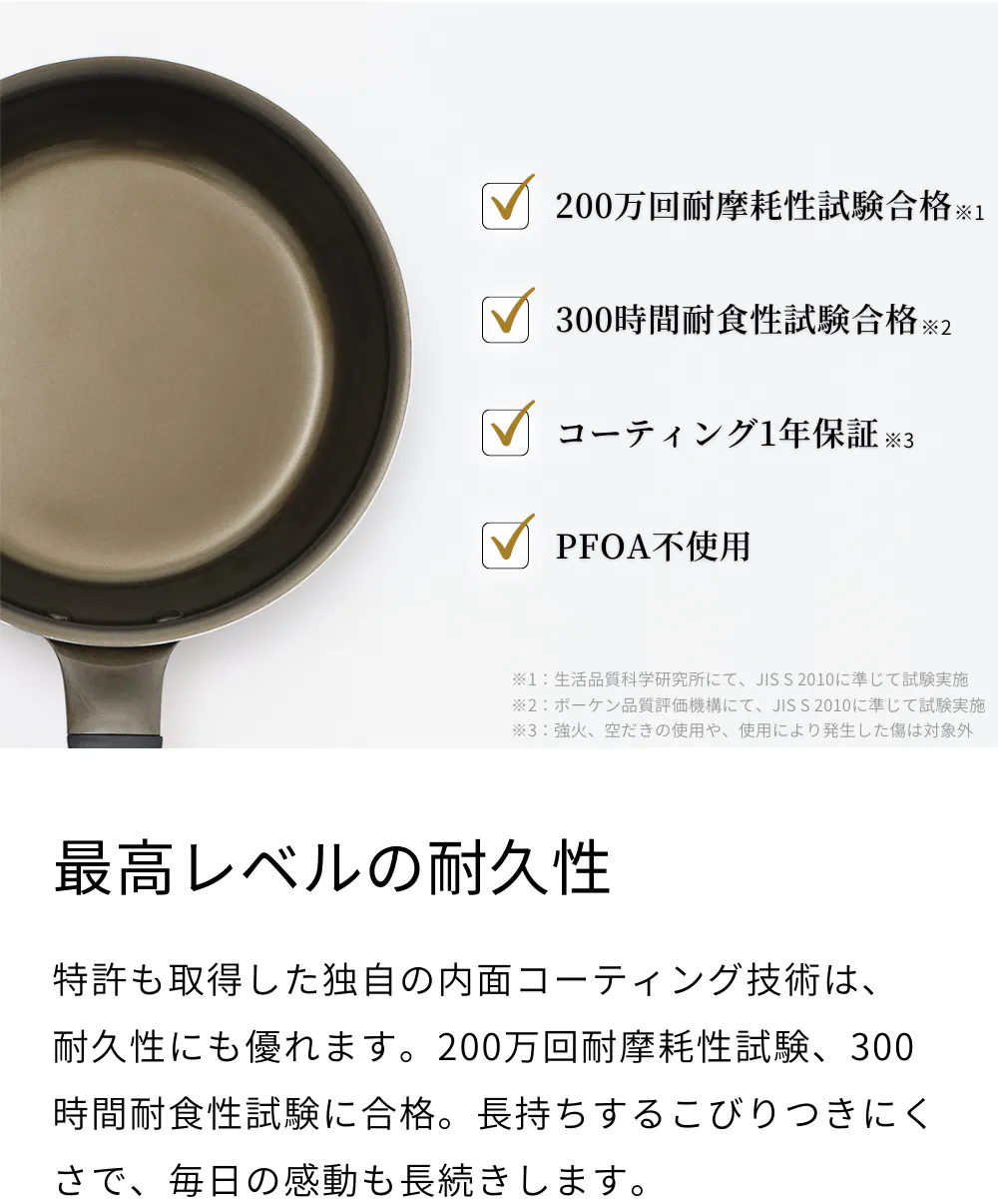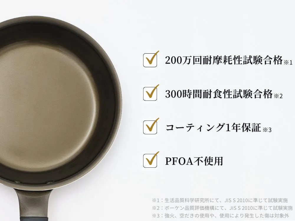 長持ちすることはもちろん、人体に有害とされるPFOAは不使用。安心安全も商品の一部です。