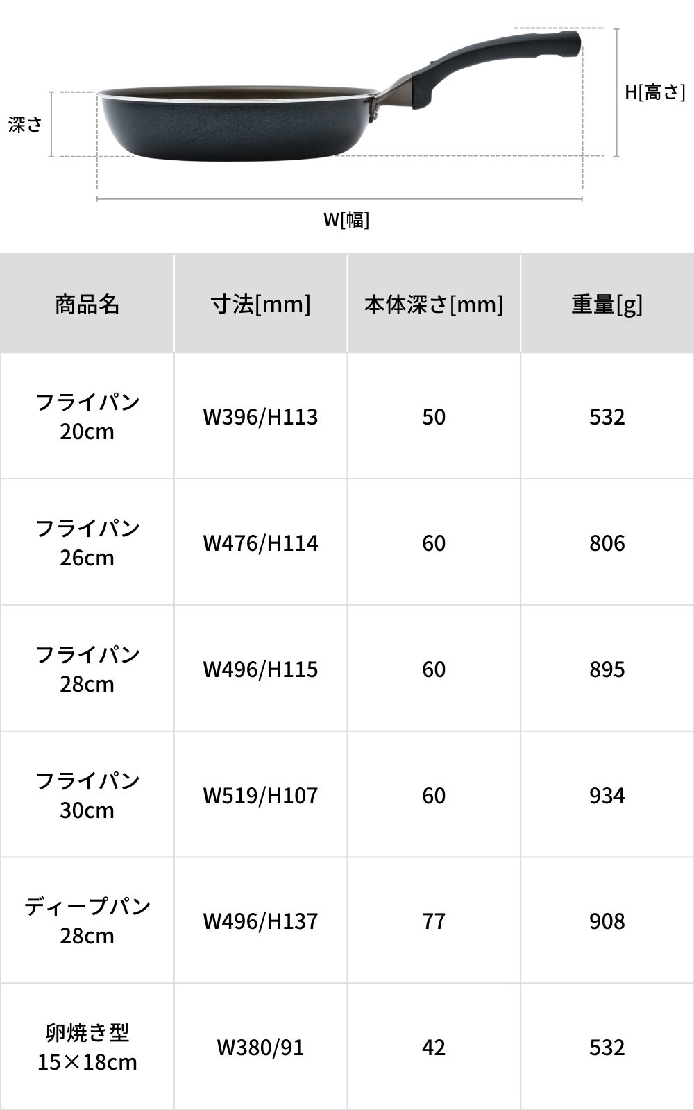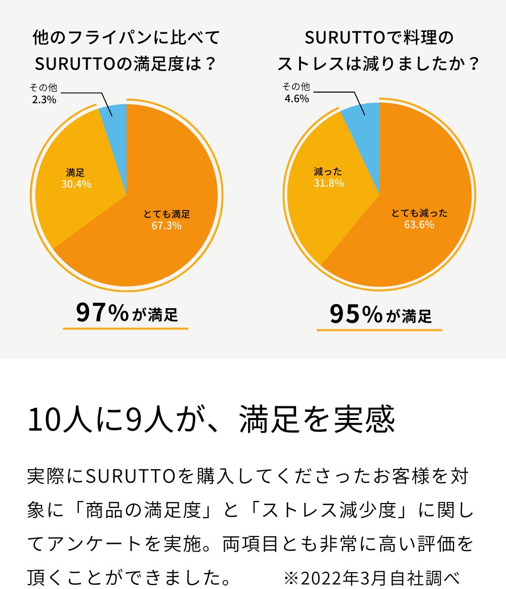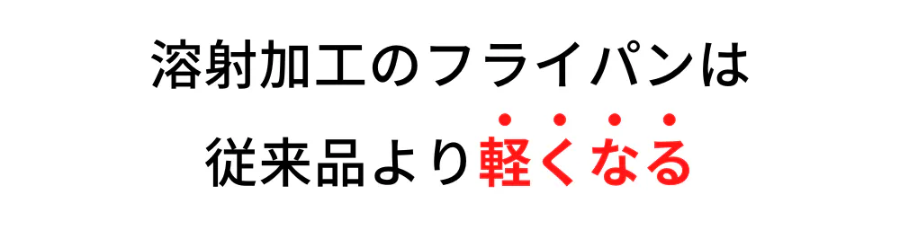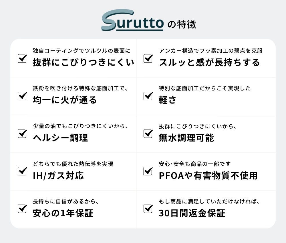 フライパンの重みに対し、女性が感じる扱いやすさのボーダーラインは1kgと言われています。SURUTTOは底面が溶射加工になったことにより、不要な重みをカットできたため、全サイズ1kgより軽くすることに成功しました。