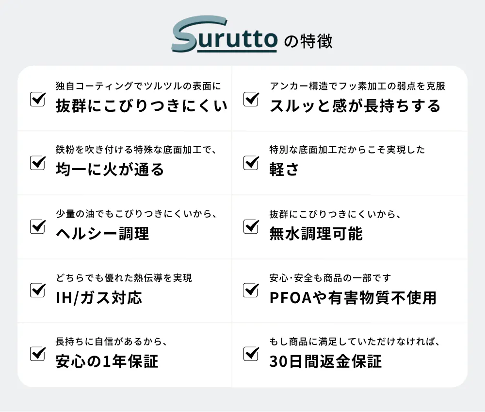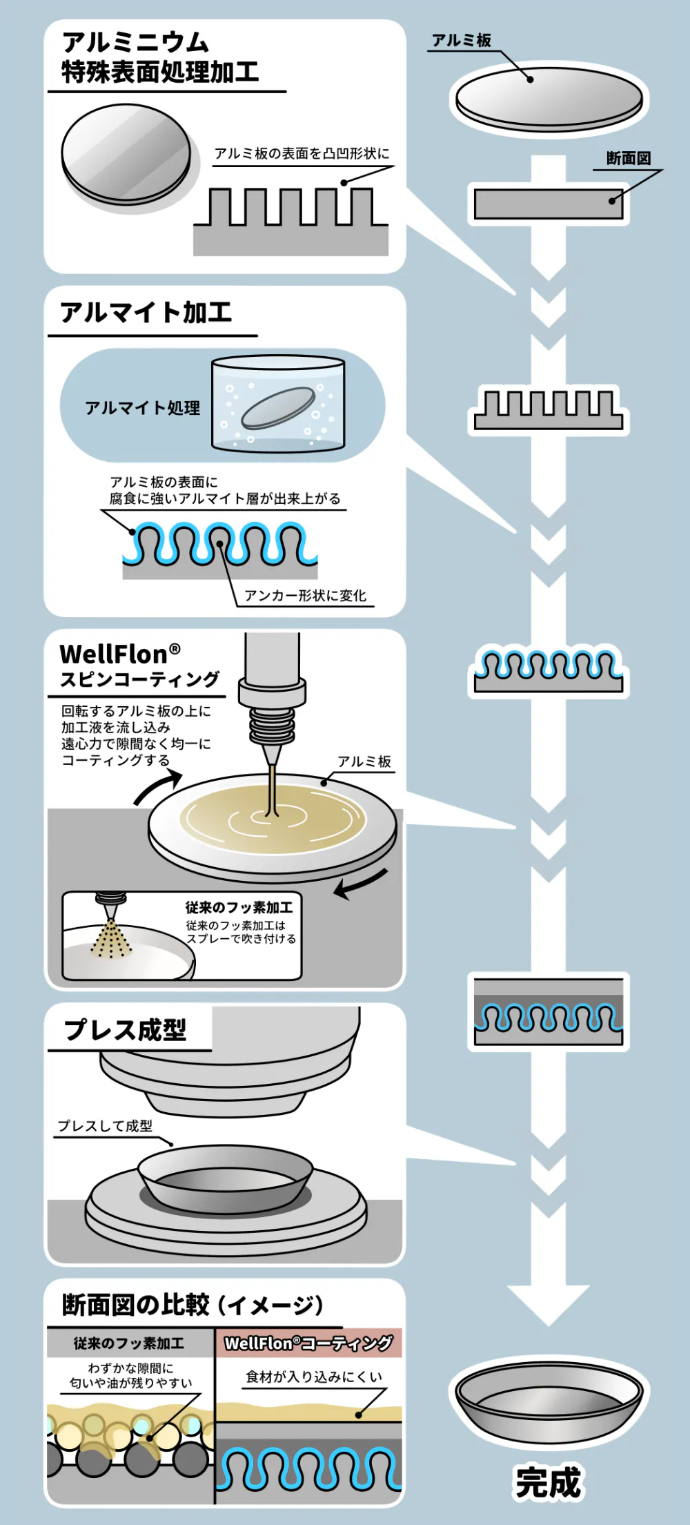SURUTTOに使われる『WellFron®スピンコーティング』というフッ素樹脂加工は、抜群のスルッと感が驚くほど長続き!