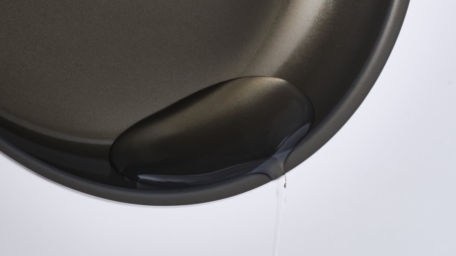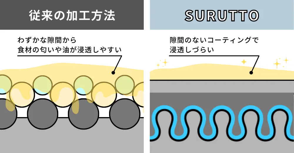 フッ素樹脂を噴射する従来のスプレー式コーティングでは、粒子と粒子のわずかな隙間から食材の油や塩分が内部に入り込み、それがフッ素コーティングが劣化する原因の1つとなっていました。SURUTTOが使用している液体式のコーティングは隙間ないコーティングで、内部に浸透しづらく、長持ちしやすい加工になっています。