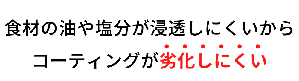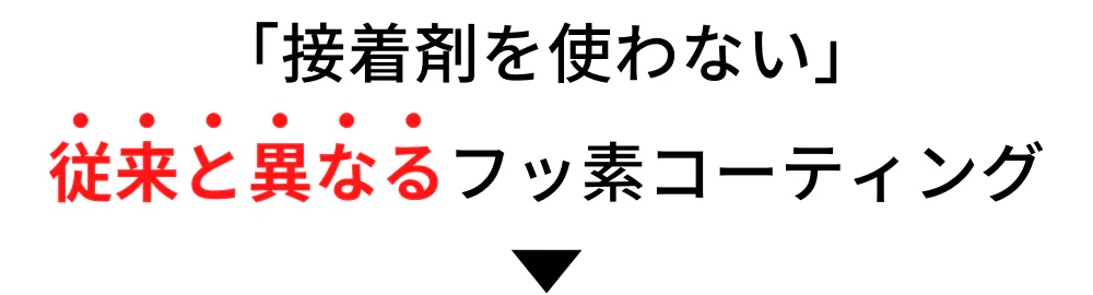 フライパンの表面加工方法として広く用いられているフッ素コーティングですが、フライパン本体のアルミニウムとは相性が悪く、従来はフッ素に接着剤を混ぜて無理やり吸着していました。しかし、その接着剤は熱に弱く、使用と共に徐々に剥がれてきてしまい、それが「こびりつき」の原因となっていました。