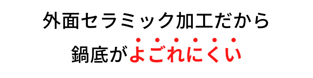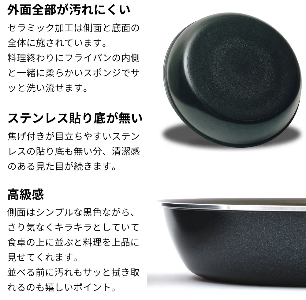 ※底が焦げ付く主な原因は「汚れがついたまま加熱してしまい、汚れが炭化してしまうこと」などです。セラミック加工は、炭化を防ぐことはできません。料理終わりはフライパンの外側もキレイに洗い流すようにしてください。