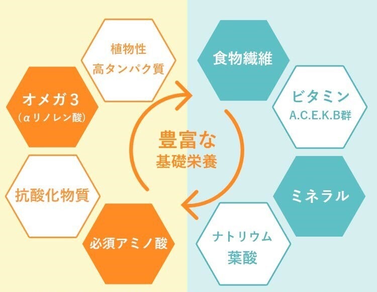 その他にもオメガ3(αリノレン酸)、オメガ6、葉酸、ビタミンB群、A、C、E、K、食物繊維、ミネラル(カルシウム・カリウム・鉄分・亜鉛・マグネシウム・リン・ナトリウム・マンガンなど)をバランスよく含んでいます。