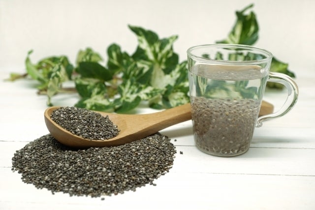 チアシードは食物繊維が多く満腹感が増し、水分を含むと約10倍に膨むので腹持ちがいいのが特徴。