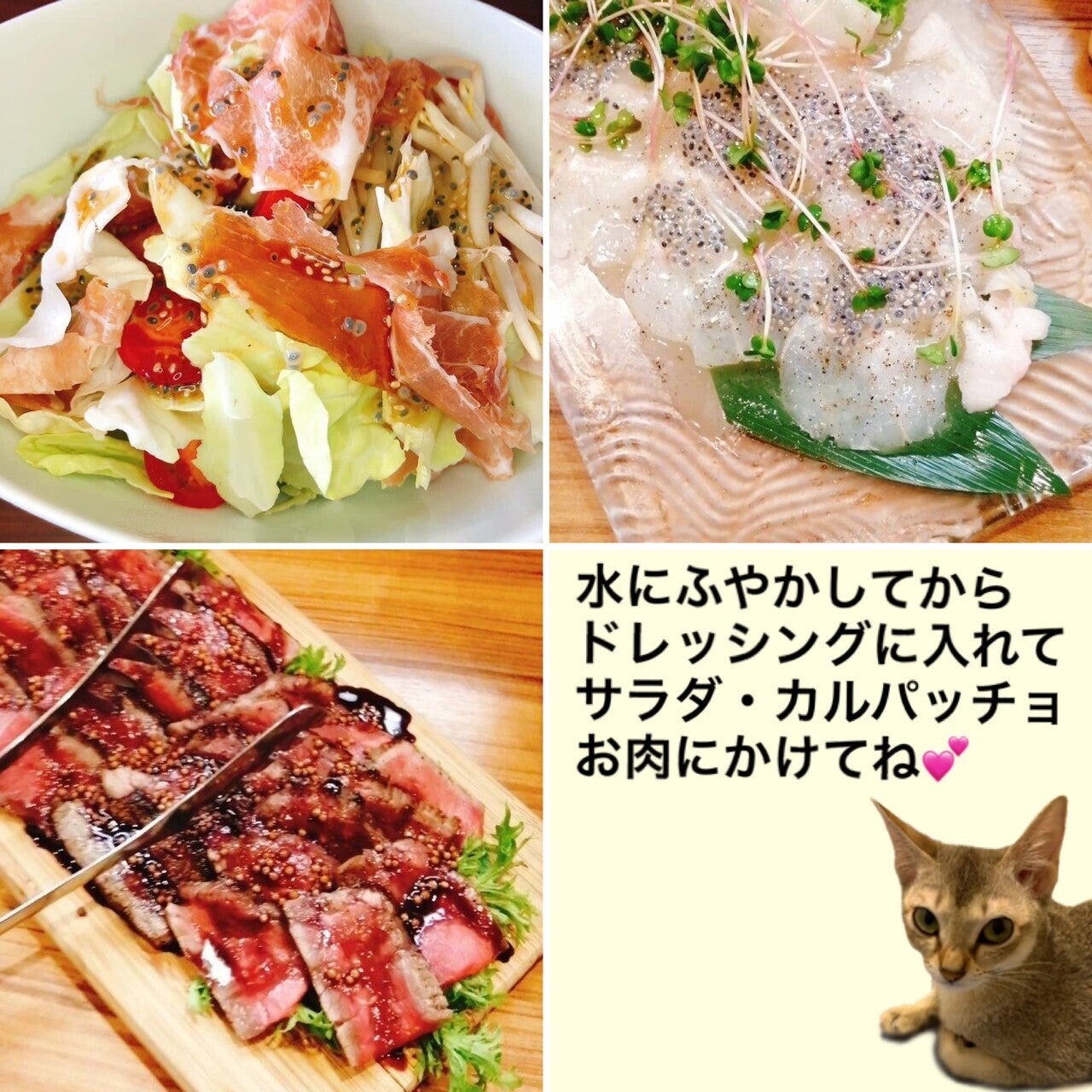 水分を含むとプルプルとした食感とシャキシャキとした歯ごたえを楽しむことができ、ジュースやスムージーに加えて飲んでもおいしく、スープやドレッシング、ステーキなどのソースなどに入れて使うこともできアレンジは無限大。