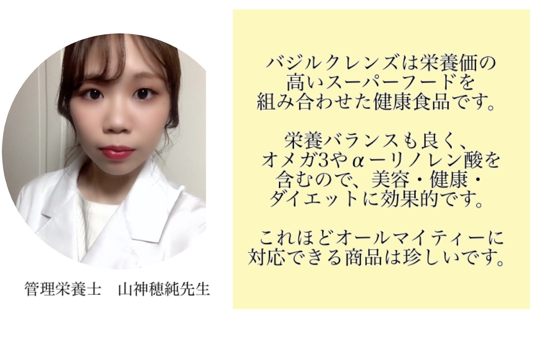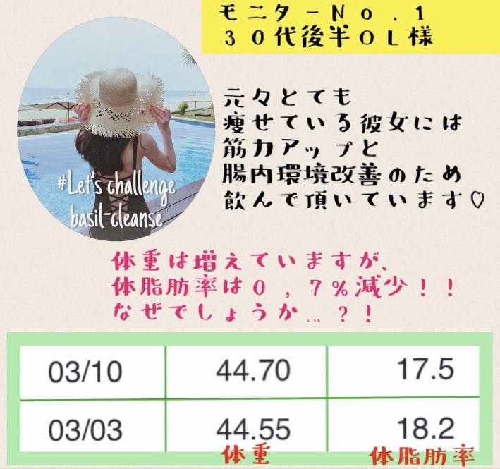現在は管理栄養士が食事指導を行いながら、「バジルクレンズ」を使ってキレイにダイエットできる方法もお話しています。