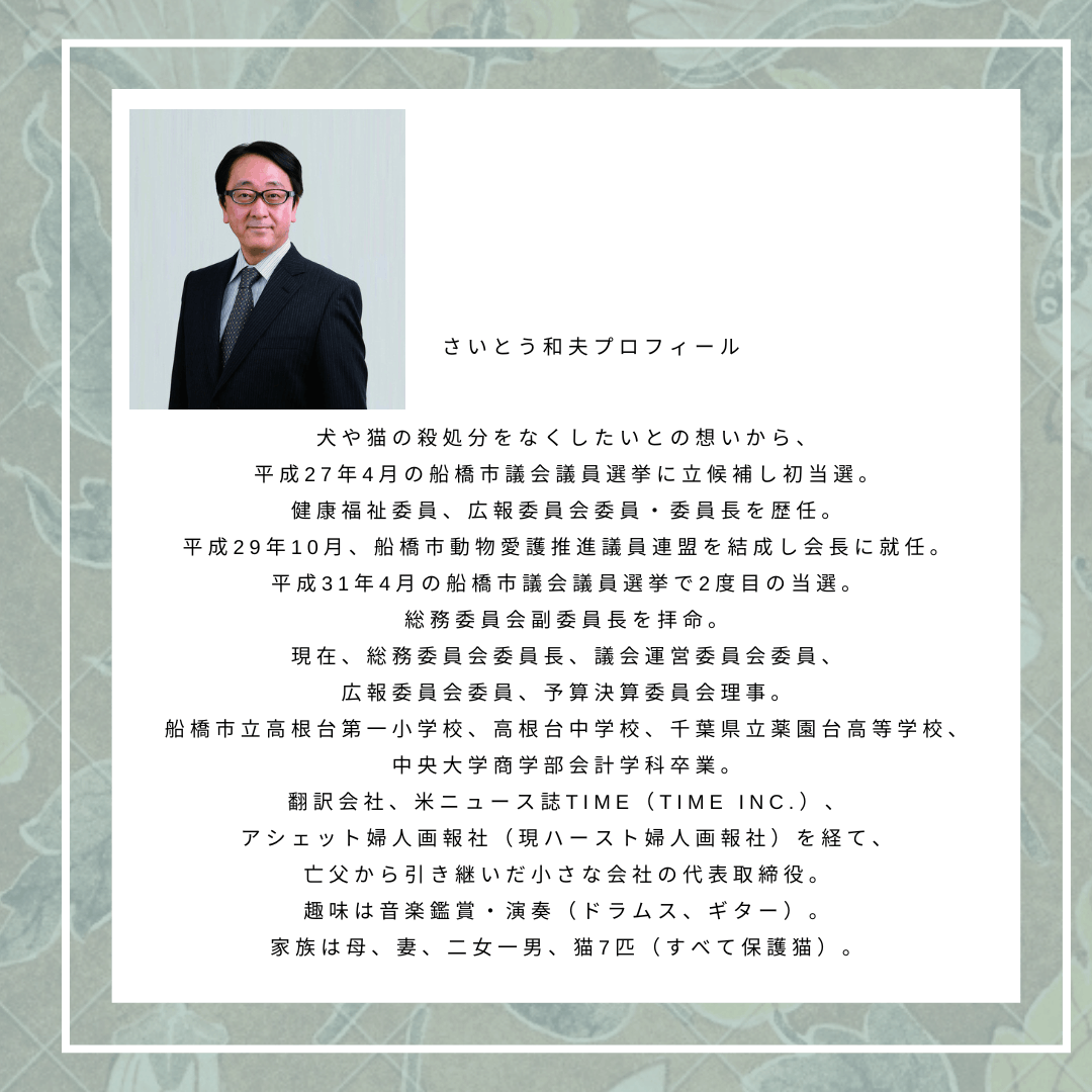 動物愛護を掲げる船橋市議会議員のさいとう和夫さんからも 応援のメッセージをいただきました! ペットの殺処分ゼロを目指し、共に頑張って行きたいと思っております。