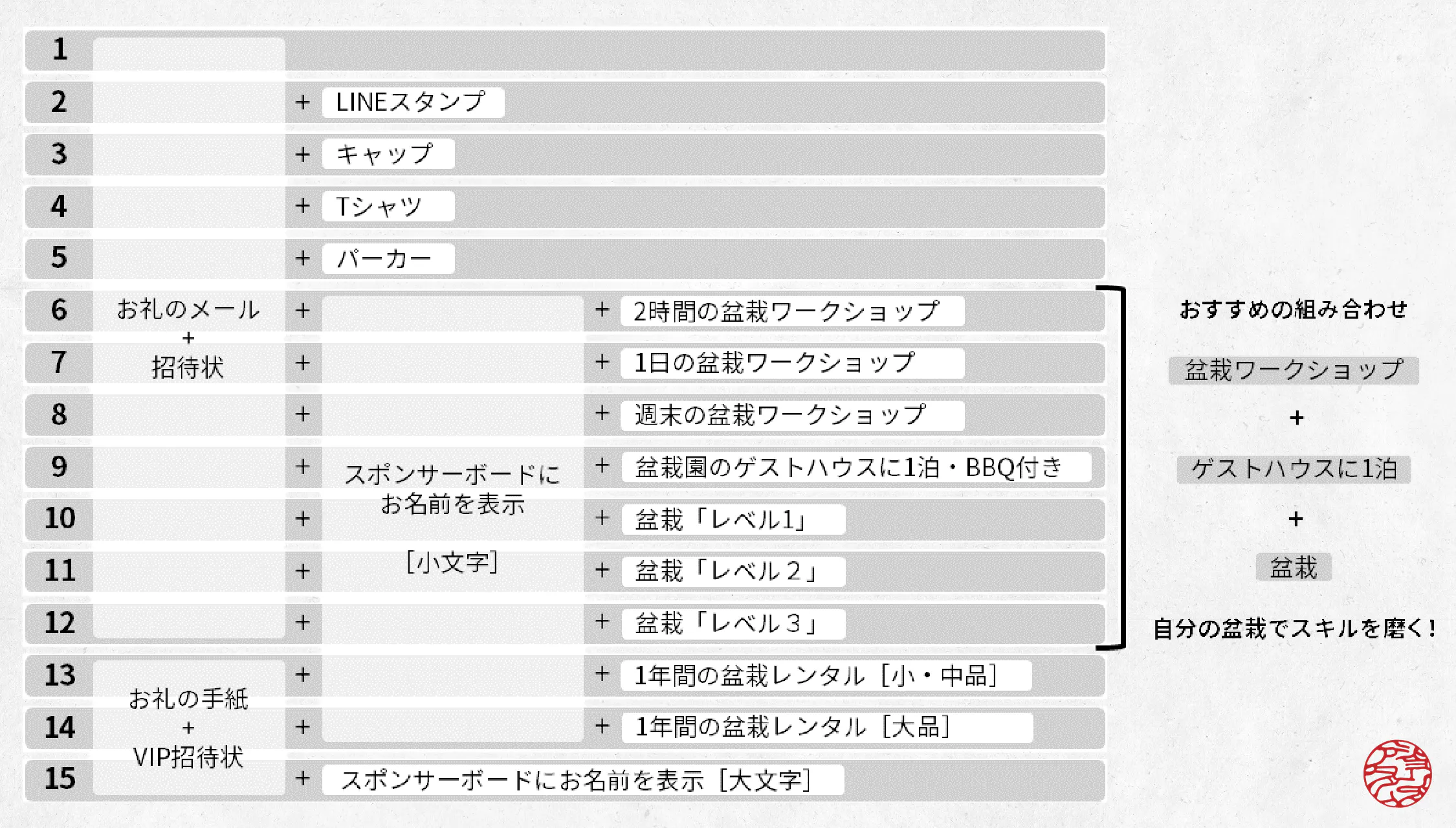 ※1万円~10万円のリターンはTree House Bonsaiの園内のスポンサーボードにお名前を小文字で表示させていただきます。