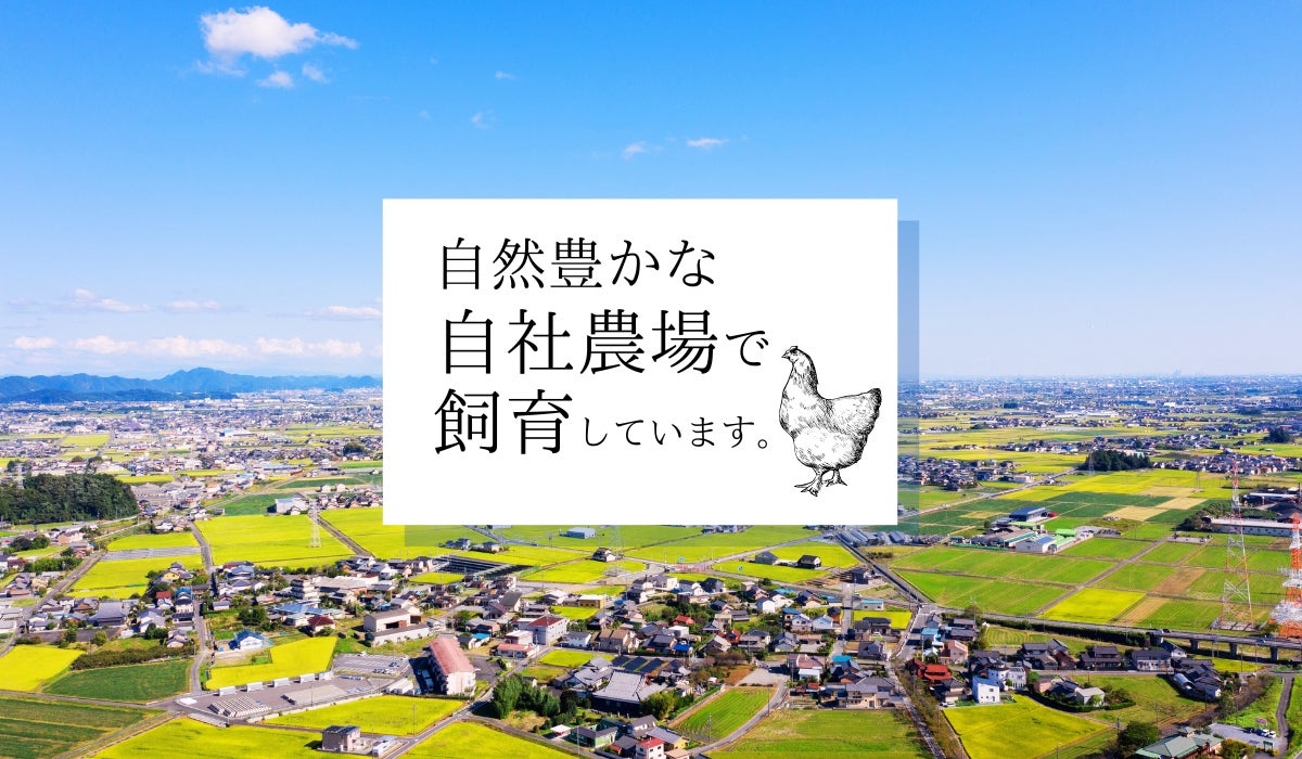 農場は6か所合わせて約4万㎡の広さで年間約25万羽を飼育。開放鶏舎で坪羽数32羽平均の低密度飼育で健康的な肉質に仕上がります。