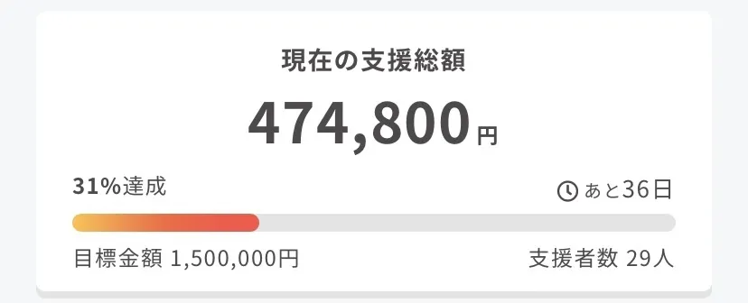この数日間の内に、大きくご支援をいただく事が立て続き!お陰様でようやく目標の達成率が【31%】を達成できております!!!