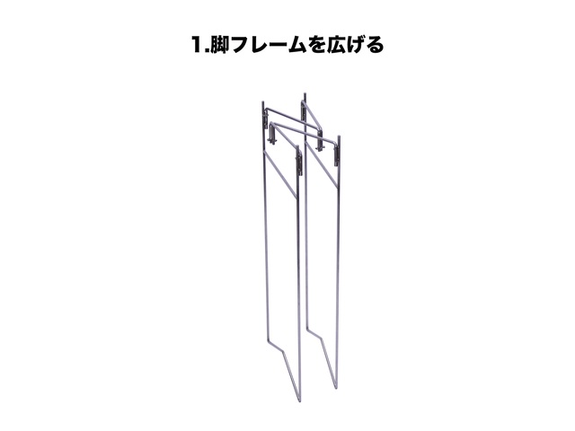 組み立て方法はとても簡単。脚のフレームは一体型となっており、両手で開くだけ。従来のように1本1本パイプをねじ込む手間は不要です。1分もかからず組み立てが完了します。