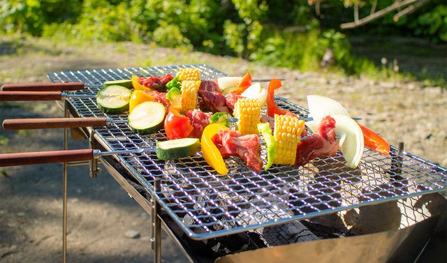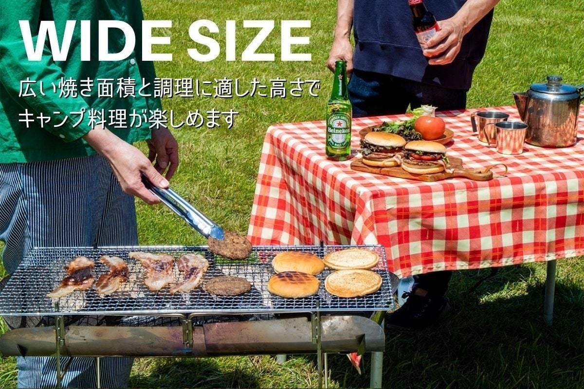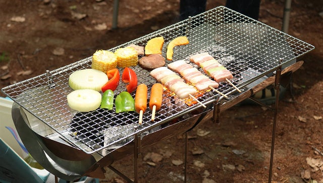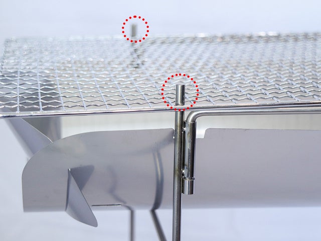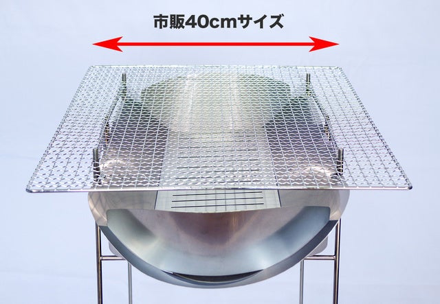 さらに独自の網留め方式を採用しているため、異なるサイズの網でも載せることが出来ます。このように大きな網にすれば、焼き上がったお肉や野菜を火から避けて置くこともできて非常に便利です。