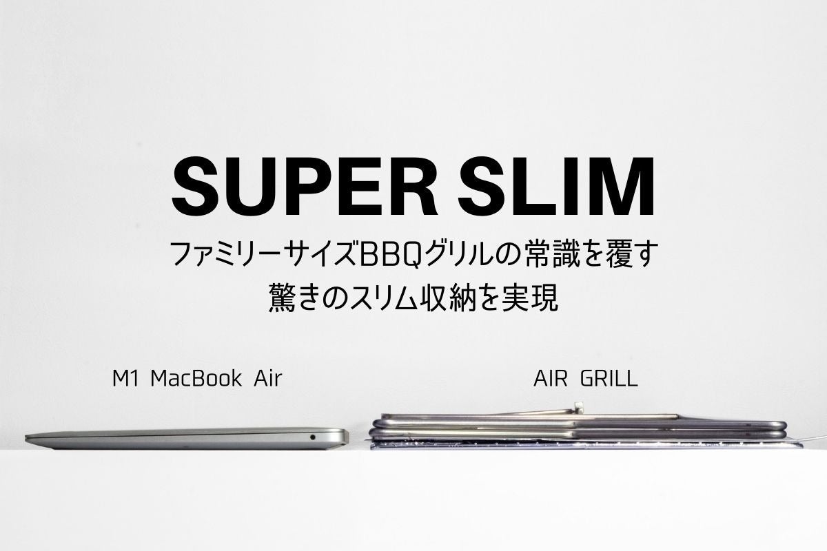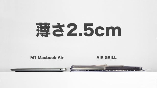 AIR GRILLは極限までミニマルなパーツで構成されており、折り畳み時は平均2.5cmで驚くほど薄くなります。M1 MacBook Airと比べてもこの通り。