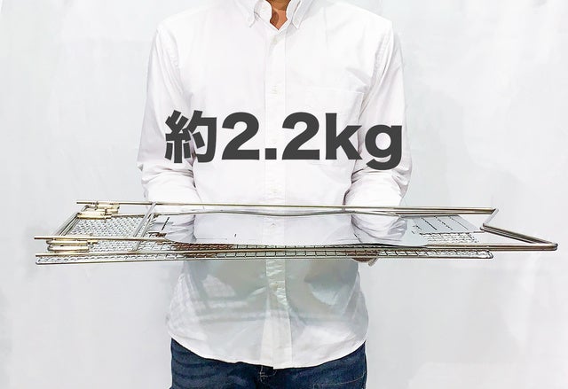 ミニマル設計のエアグリルの重量はわずか約2.2kg。同じ焼き面サイズのバーベキューグリルは4〜6kg程度のものが多く、比べると半分程度の軽さです。