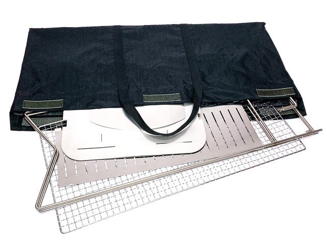 AIR GRILLには標準装備で収納バッグが付いており、軽さと相まって持ち運びのストレスがぐっと軽減します。丈夫なポリエステル生地で耐久性はバッチリ。フラップはマジックテープで簡単に開閉し、間口が広くグリルの出し入れもラクです。多少のゆとりがあるので、火バサミやライターなども一緒に収納可能です。