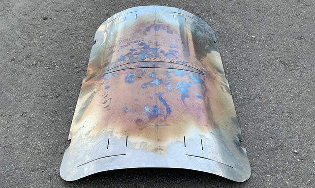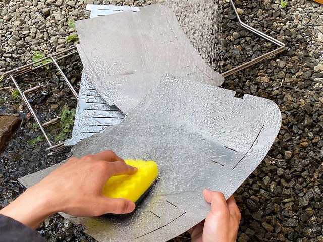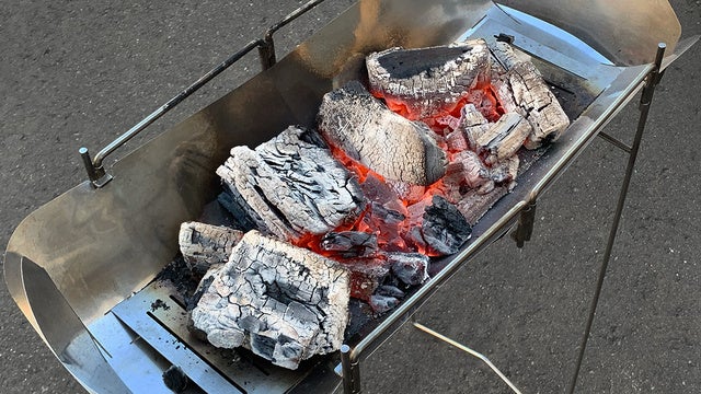 AIR GRILLの上で50時間炭を燃やし続けました。熱による穴あきや破損などはありませんでした。プレートに焼き色と湾曲の癖はつきましたが、使用にも収納にもまったく問題のないことが確認できました。