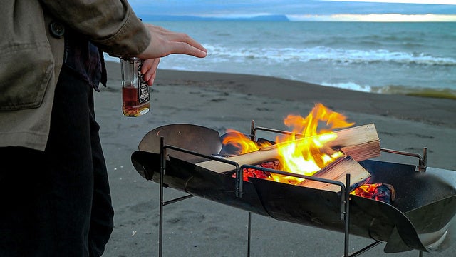 網を外せばBBQグリルから焚き火台に変身。火床が大きいので市販サイズの薪が簡単に載せられます。