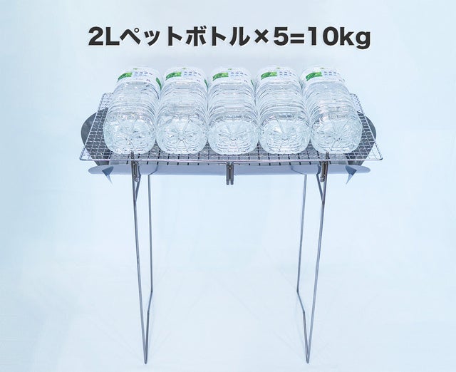 2Lペットボトルを5本、計10kgをグリルに乗せても、変形や歪みはありません。10kgとは、グリルに木炭を満載にし、網全面に食材を広げても問題のない耐荷重です。強度の心配なくバーベキューを楽しむことができます。