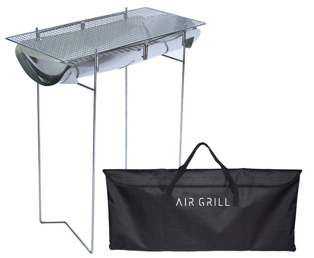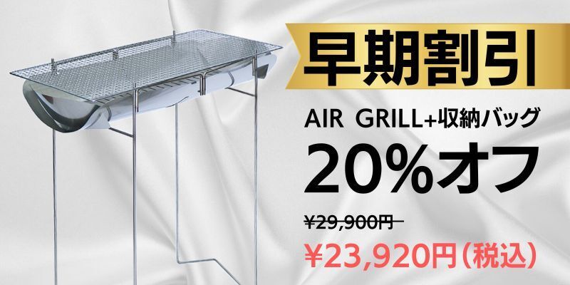 AIR GRILL本体、収納バッグ、焼き網のセットとなります。早割は数量限定で先着順となりますのでお早めにどうぞ。