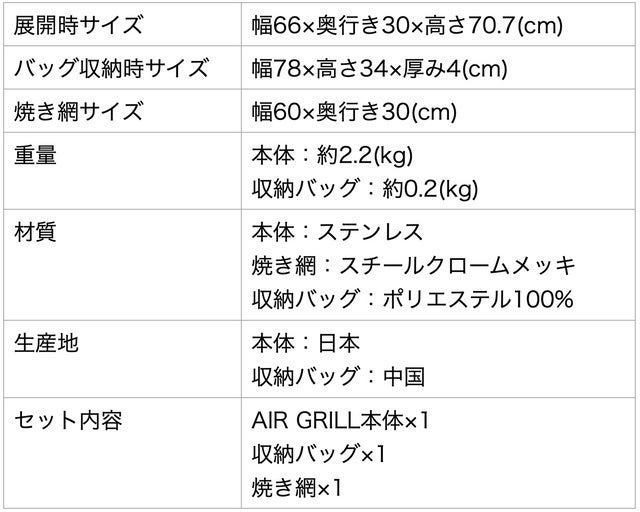 AIR GRILLは気軽に市販の網が代用できるよう、ホームセンターなどで広く流通している60×30cmサイズを採用しています。出かけ先で綺麗な網に交換したくなった時にも便利です。