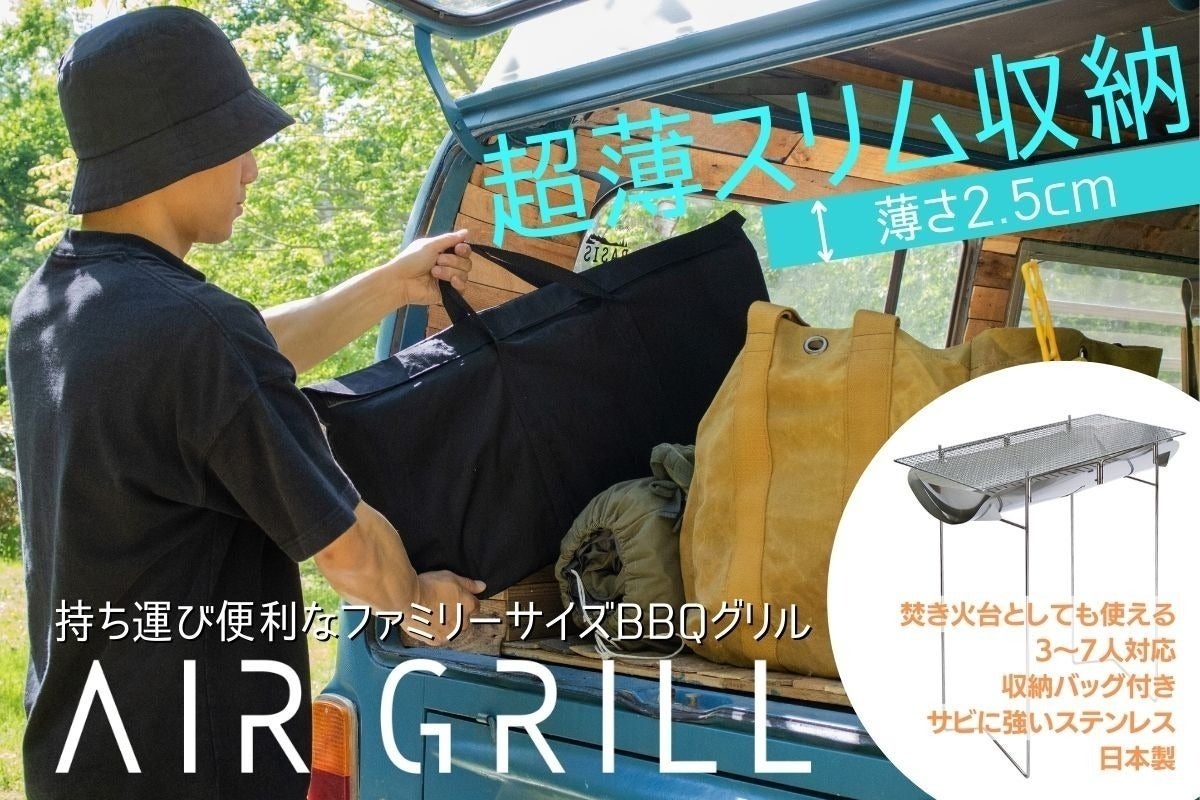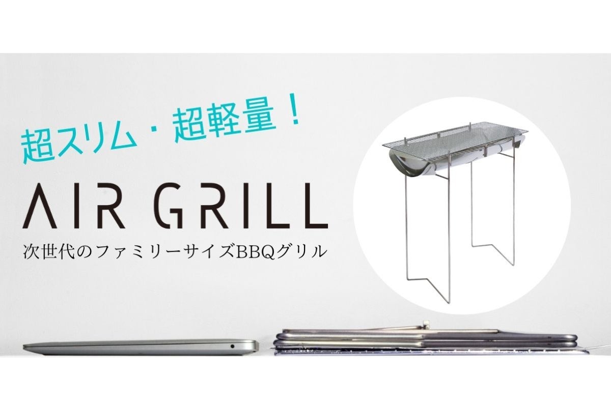 AIR GRILL(エアグリル)はファミリーサイズBBQグリルの悩み「重くてかさばる」を解消! 極限までミニマルな構造にしたことで、広い焼き面積を確保しながらも「軽量さとスリム収納」を実現した次世代のBBQグリルです。