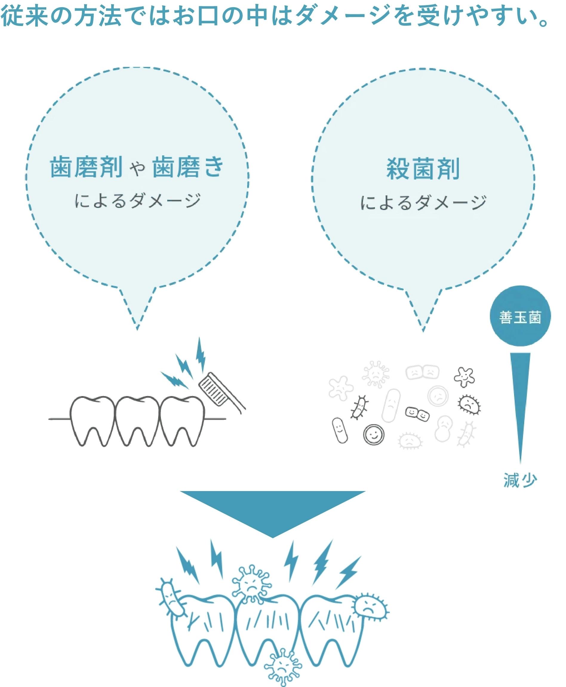 歯磨剤や力を入れすぎたブラッシングは歯の表面に細かな傷を付け、プラークや雑菌が付着しやすくなります。また、マウスウォッシュ等の殺菌作用は悪玉菌と一緒に口内にいる善玉菌も殺菌してしまうため、体内の細菌バランスが崩れやすくなります。