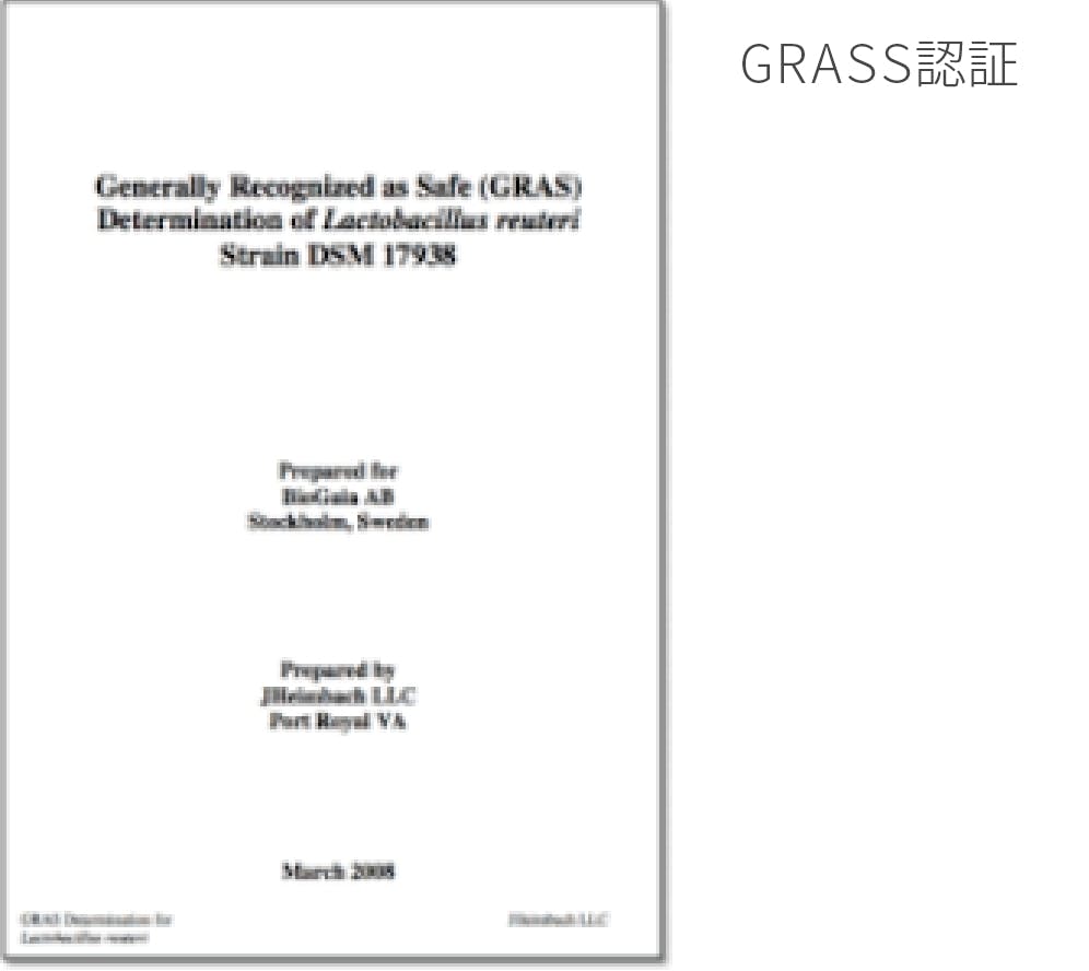 一口にロイテリ菌といっても数多くの種類があり、それぞれの種類で特性が少しずつ違うのですが、バイオガイア製品のL.ロイテリ菌は、体内細菌のバランス調整に特に有効と思われる数種類で特許を取っていて、FDA(アメリカ食品医薬品局)の安全証明であるGRASS認証も取得しています