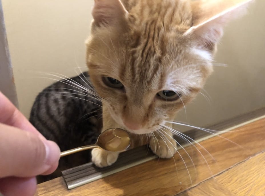 きいちゃんは少し苦手のよう…そんな時は、フードやおやつに混ぜて与えてもOKです!